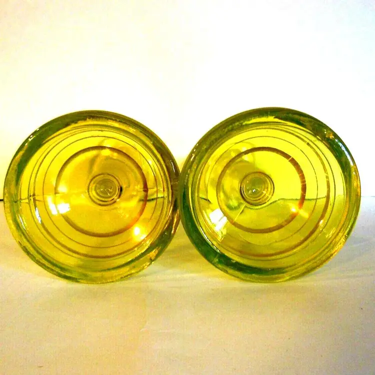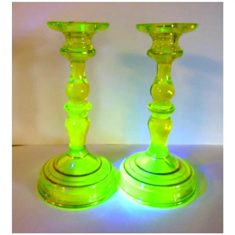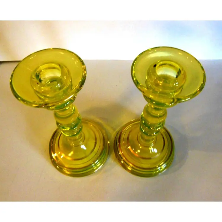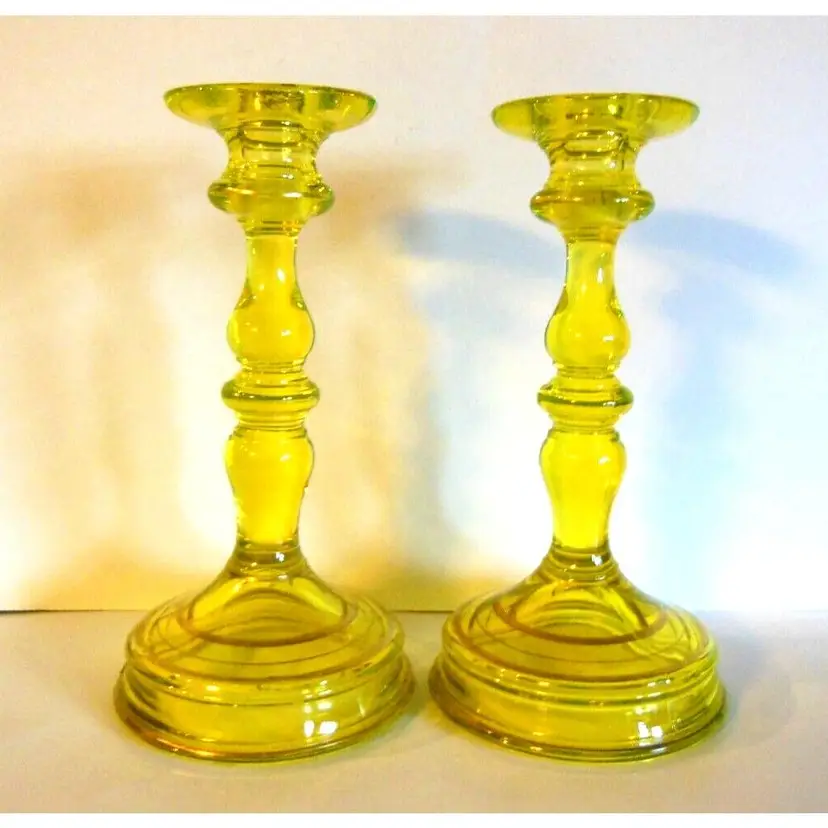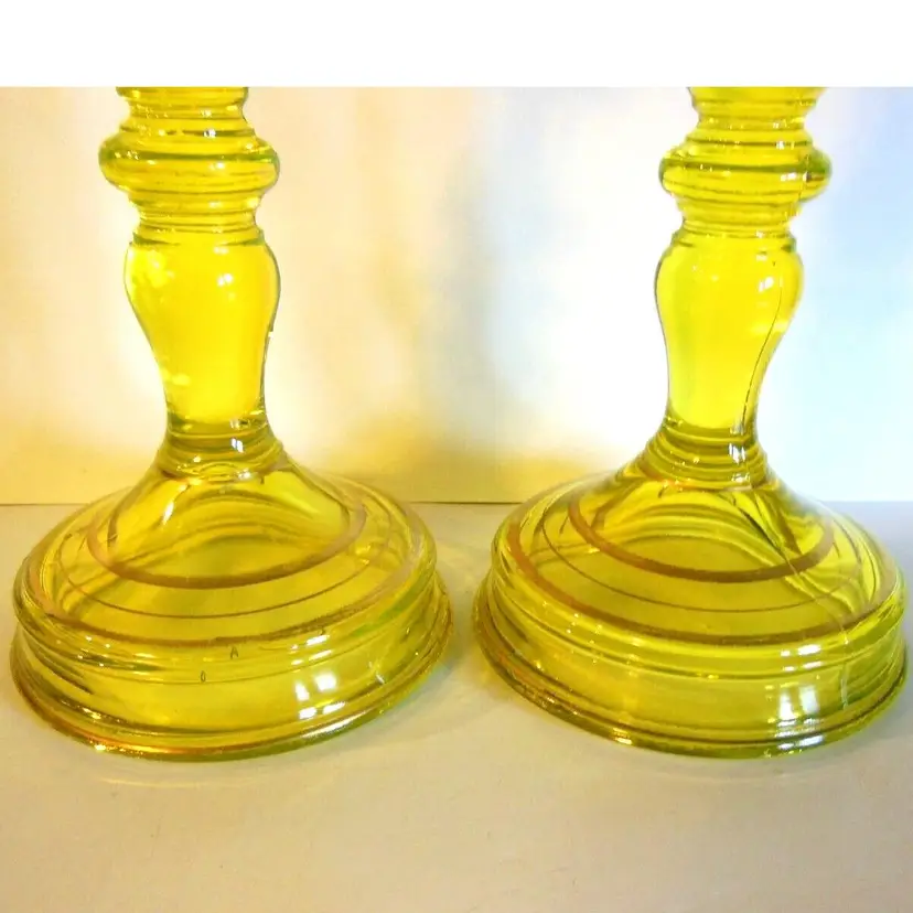 This is a VERY, VERY RARE, #Antique 1923, pair of #TiffinGlass, #76 #Candlesticks / #CandleHolders, in #Canary Yellow / #VaselineGlass. They have real gold paint striping on the bases.