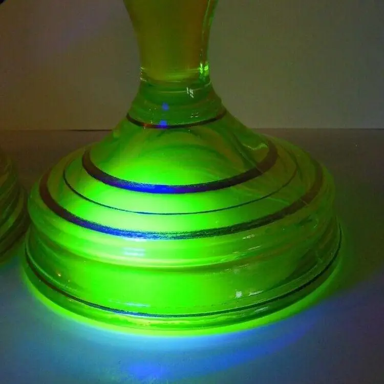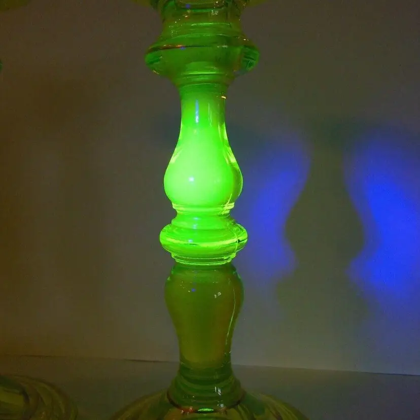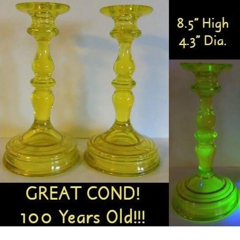 They are 100 years old and have aged beautifully!!! They contain #uranium glass (at very safe levels lol) and they #glow VERY, VERY NICELY under UV light!!! They are each 8.5" high and 4.3" in diameter at their widest area.