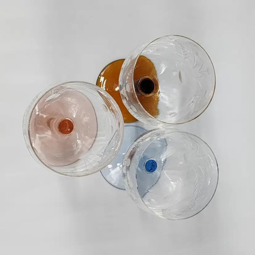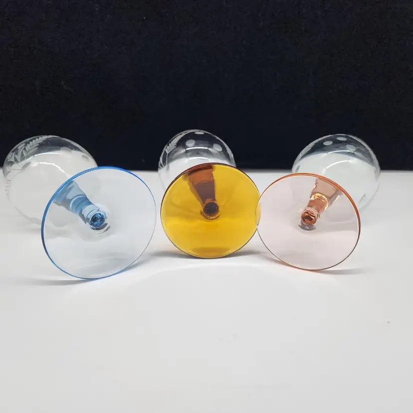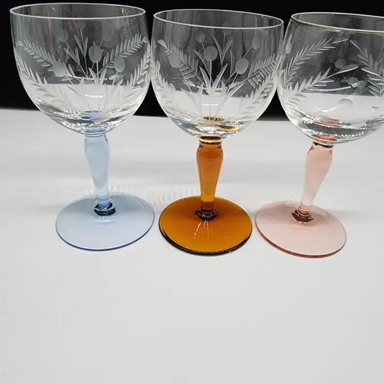 A vintage Tiffin Etched Blue Pink & Amber Stemware Wine Glass, 5.5" in height. This multicolored piece from Unbranded features a stunning Baroque & Rococo style, crafted from crystal.