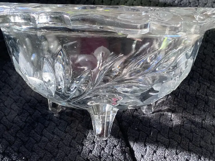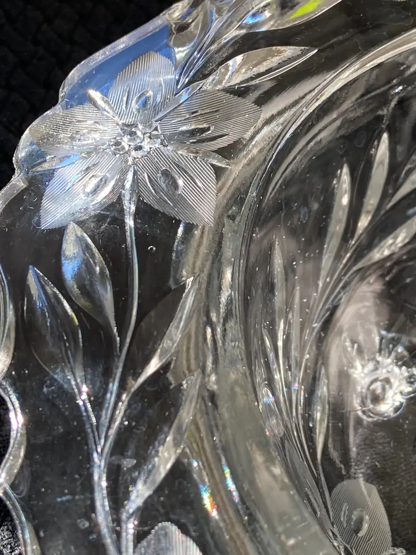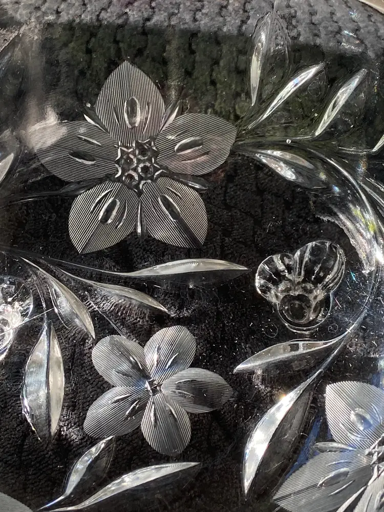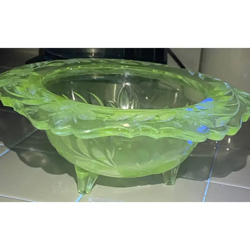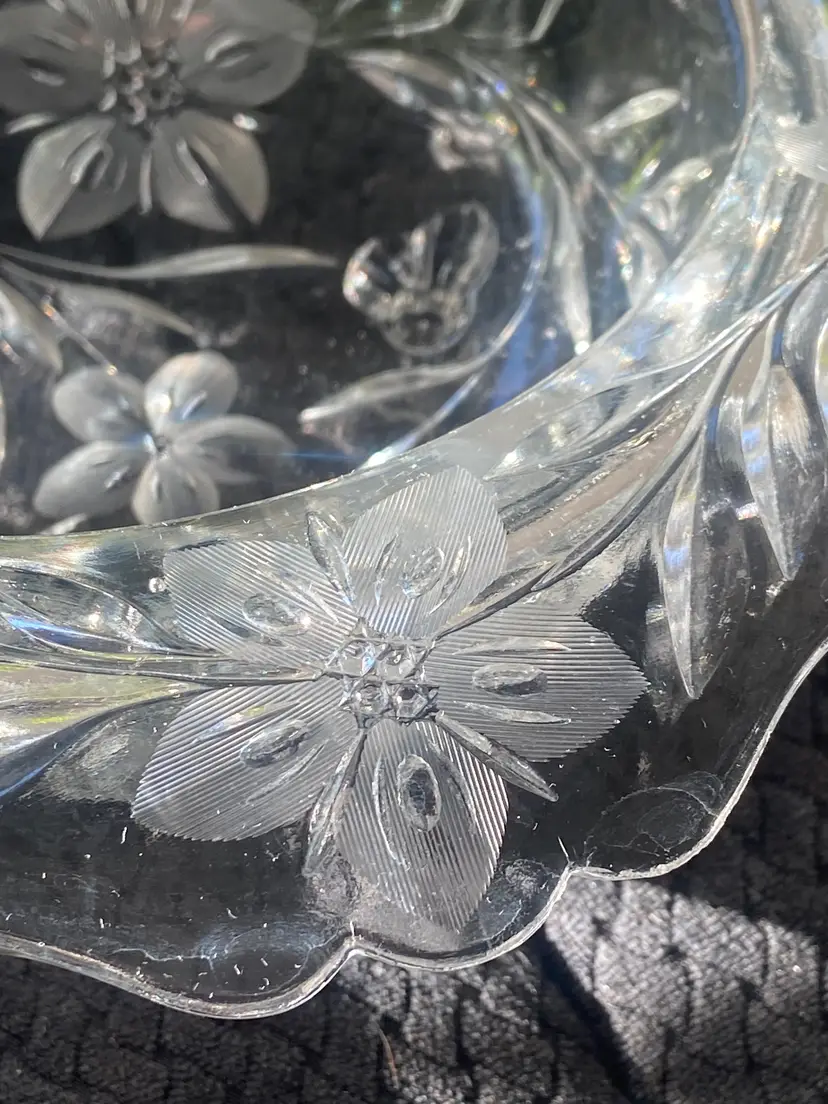 Elevate your table setting with the Tiffin Large Clear Glass Bowl, (that glows green under UV light) featuring the charming Shaggy Daisy design that brings a touch of vintage elegance to any occasion. The floral pattern encompasses the entire bowl, making it a statement piece for both casual and formal gatherings. Crafted from high-quality glass, this round bowl measures 10 inches in diameter and stands 4 inches tall, with a comfortable weight of 3 lb 1 oz that speaks to its sturdy construction.Proudly manufactured in the United States, this bowl belongs to a rich tradition of North American glassware artistry. Its heritage is evident in the meticulous detail and the timeless appeal of its clear color, ensuring it will complement any decor or table theme. Whether used for special events or displayed as part of a collector's treasure, this Tiffin piece is a testament to the artful beauty that glass can achieve.