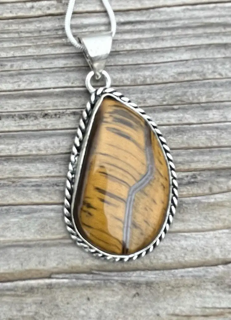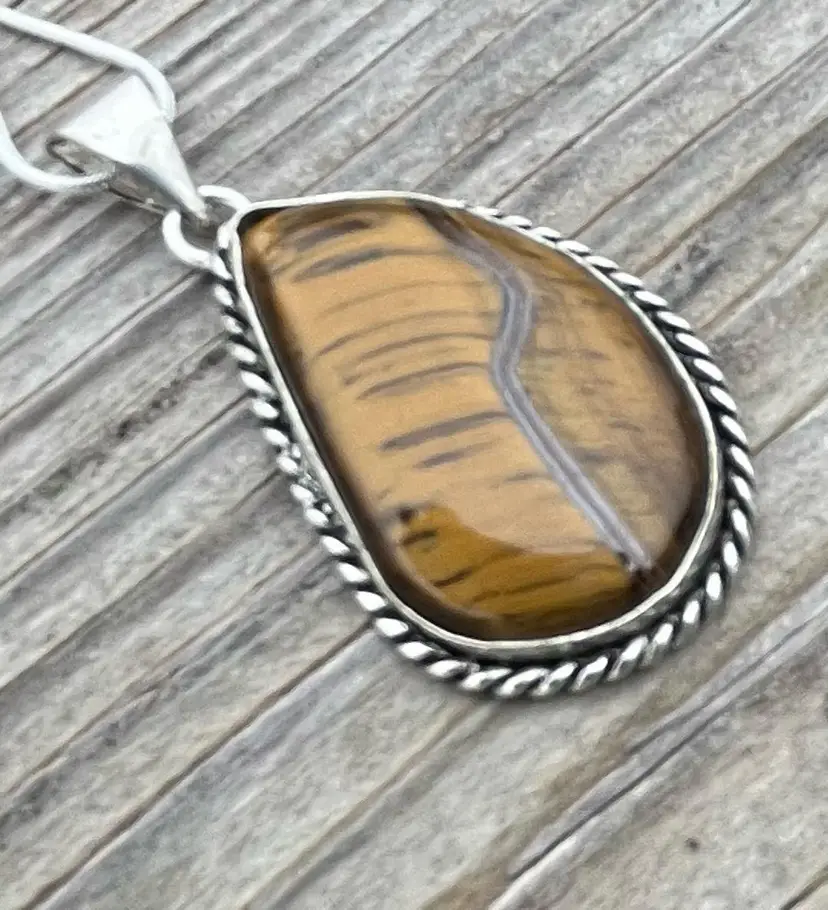 A Tiger Eye 925 Sterling Silver Necklace. Pendant is approximately 2 inches long and 1 inch wide. On a 16 inch 925 sterling silver chain.