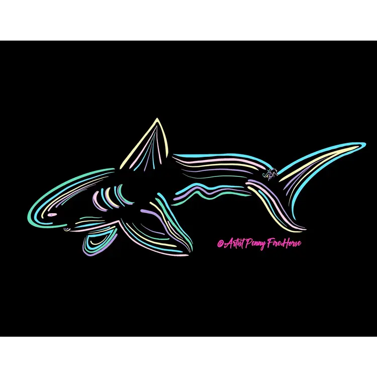 This Tiger Shark is the 1st illustration within Artist Penny FireHorse’s Neon Sea Creatures Series. Immerse yourself in the vibrant realm of Neon Sea Creatures, where artistry meets the mesmerizing allure of the ocean. This collection draws inspiration from the captivating beauty of marine life, capturing its dynamic energy and vivid hues. Each artwork exemplifies Penny’s distinct style, seamlessly merging realism with a neon-infused palette, resulting in visually striking and captivating creations.
