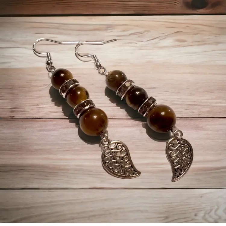 These handcrafted gemstone earrings are made with Tiger’s Eye.