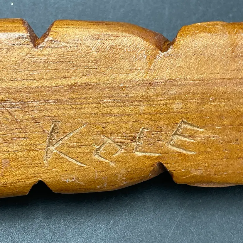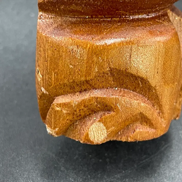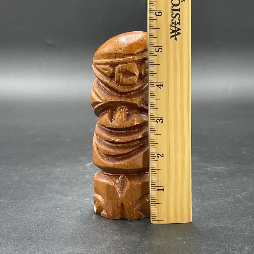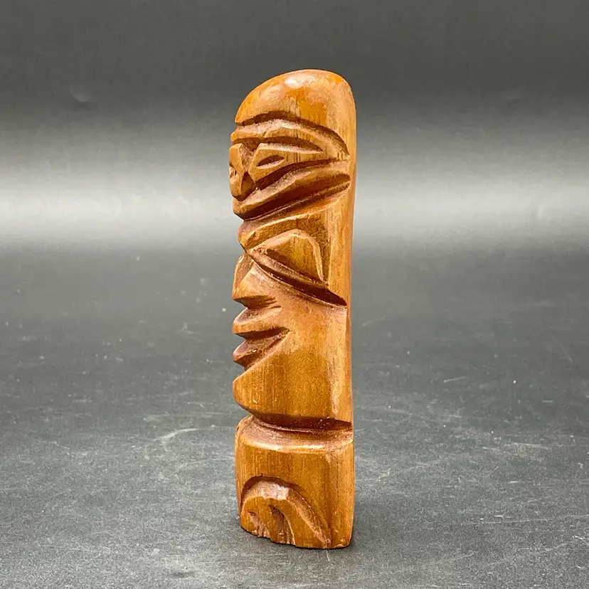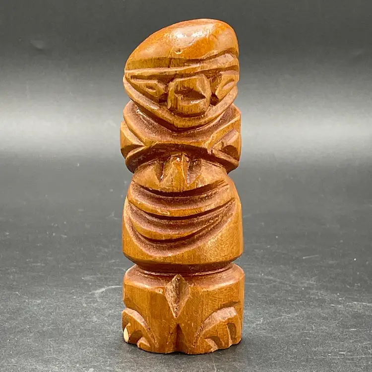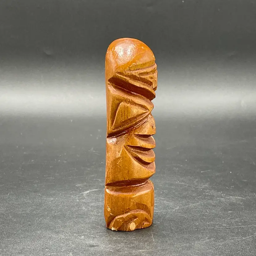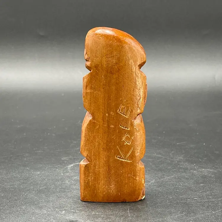 This is a vintage hand carved wooden Tiki figurine. Signed Kole on the back. Measures approximately 5.5" tall. There is a small bruise to the wood near the bottom edge of one side as shown in pictures. No other major flaws.