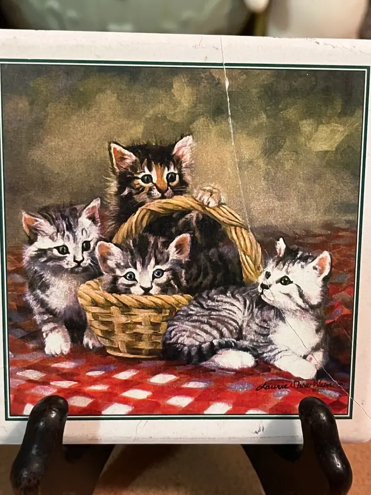 Individual Tile Coaster with the image by Laurie Hein, “Having A Picnic” featuring kittens in a picnic basket.