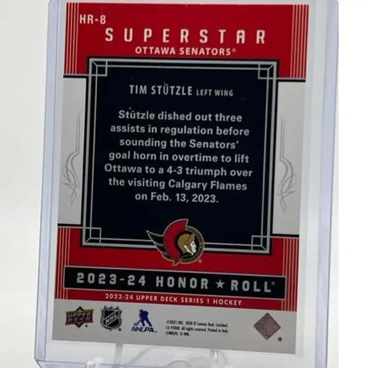 Tim Stutzle 2023-2024 Upper Deck Series One Hockey Honor Roll Insert Ottawa Senators. Shipping is $1 for the first card, +$0.50 for additional cards, and ships PWE within 1-2 days.