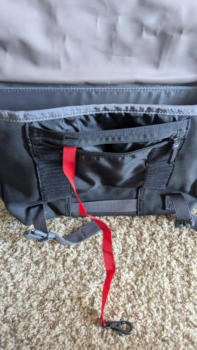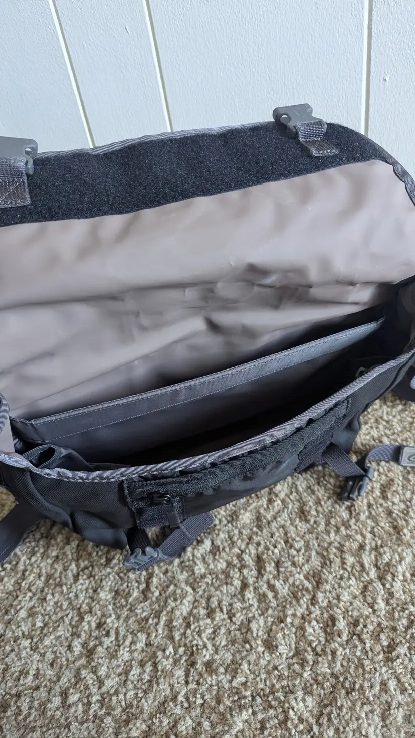 Lightly used XS messenger bag. Under flap there is 1 slip pocket, and 1 zippered pocket with a key leash inside. Inside the main compartment there is a tablet sleeve, 2 slip pockets, 1 zippered pocket and 2 elastic sleeves. Tablet sleeve is 10"x6" Feel free to message with any questions.