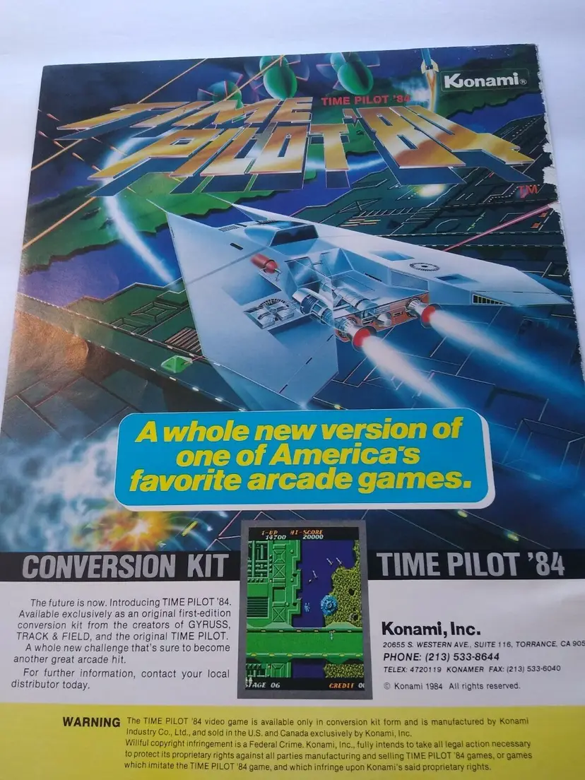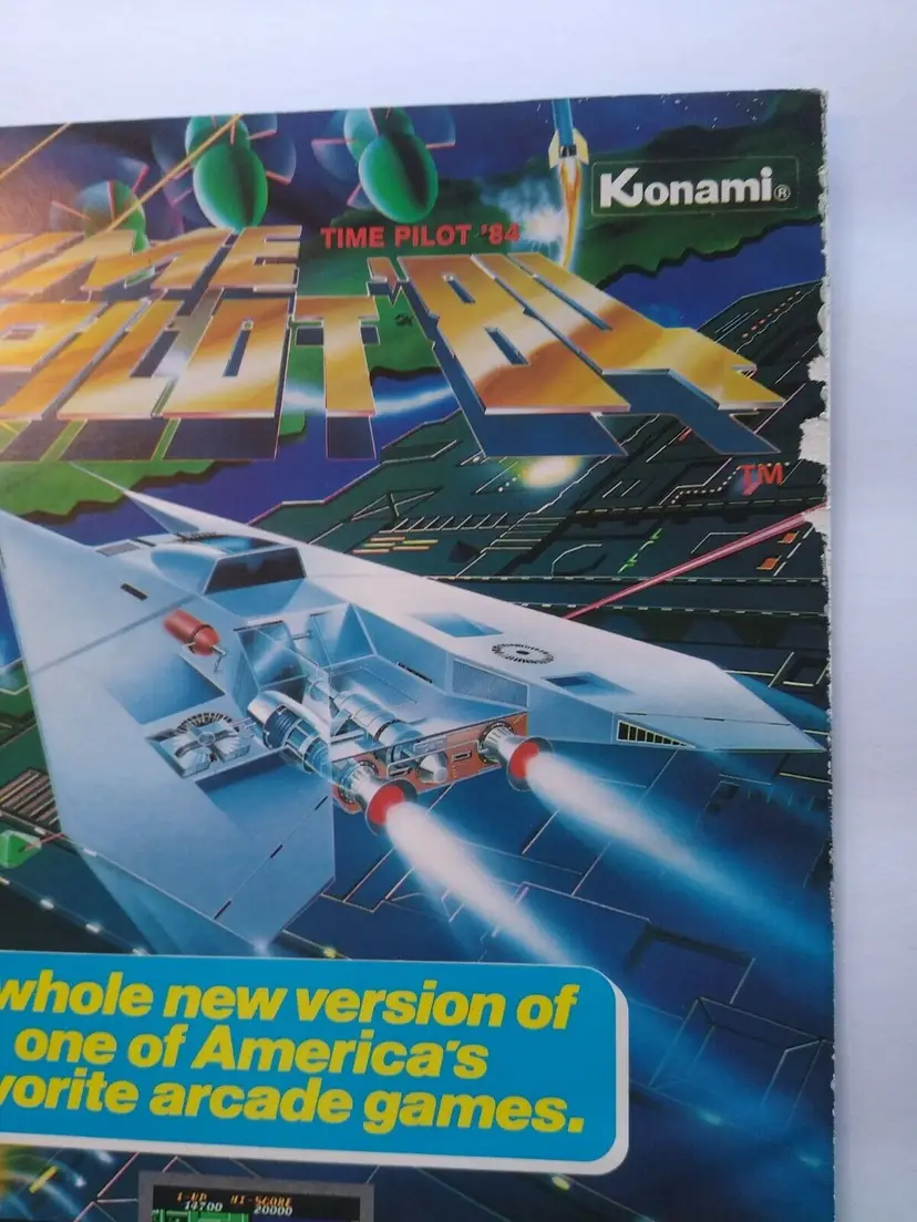 Magazine: AD Modified Item: Yes Country/Region of Manufacture: United States Original/Reproduction: Original Year: 1984 Game Title: Time Pilot 84 Modification Description: Edge wear. See notes. Brand: Konami