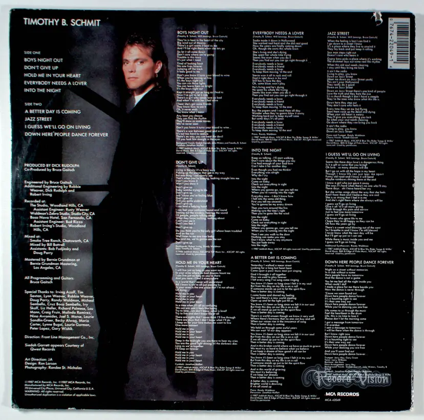 Timothy B, by Timothy B. Schmit, marks the solo debut of the veteran vocalist best known as the bassist and harmony singer for the Eagles, showcasing a shift toward sophisticated blue-eyed soul and adult contemporary pop. Historically significant for bridging the classic rock era with the burgeoning smooth jazz fusion scene of the late 1980s, the album features Schmit's lush, emotive delivery over polished arrangements blending electric guitars, keyboards, and subtle horn sections. A unique fact is that it was largely co-written and co-produced by Schmit himself alongside session collaborators, recorded in intimate Los Angeles studios that captured his personal songwriting evolution post-Eagles hiatus. Fan-favorites among listeners include the upbeat opener Boys Night Out, the heartfelt ballad Hold Me In Your Heart, and the extended groove Down Here People Dance Forever, praised for their infectious melodies and radio-friendly polish.