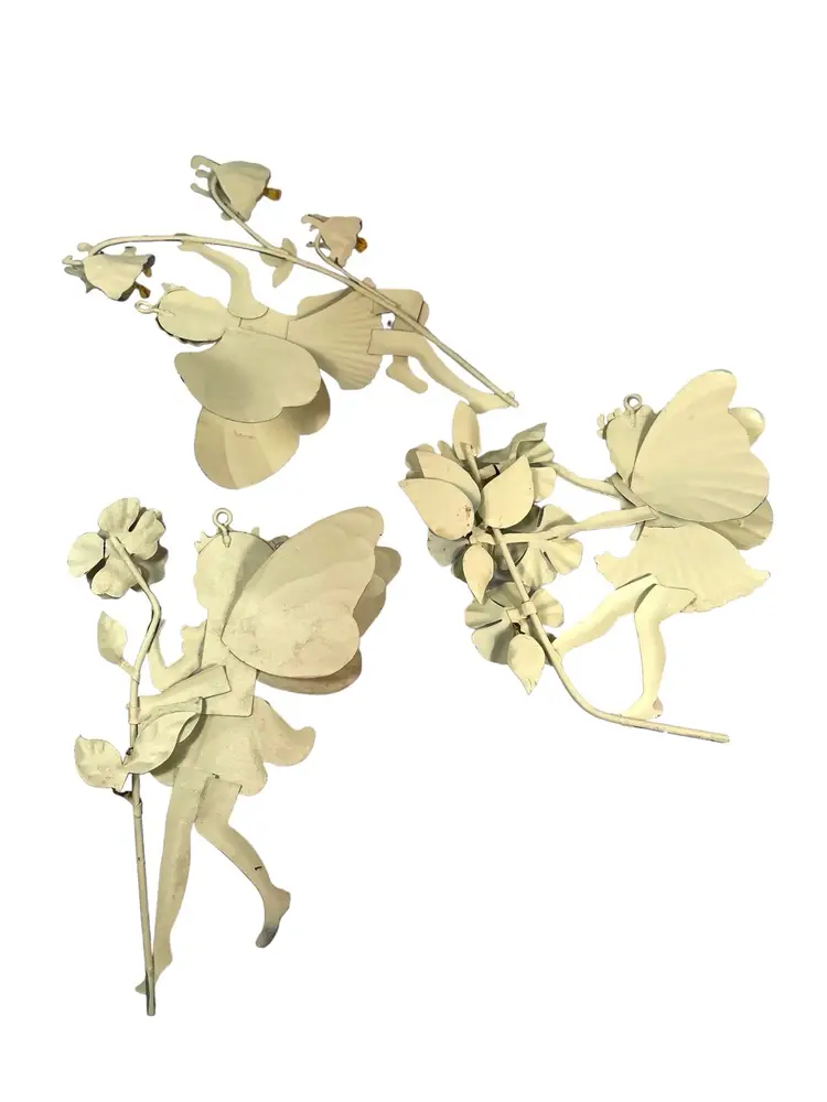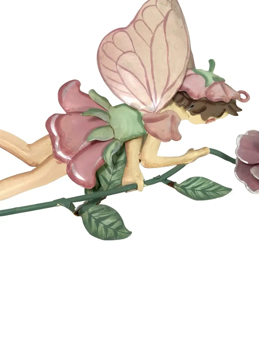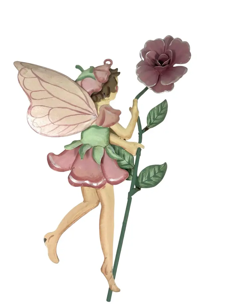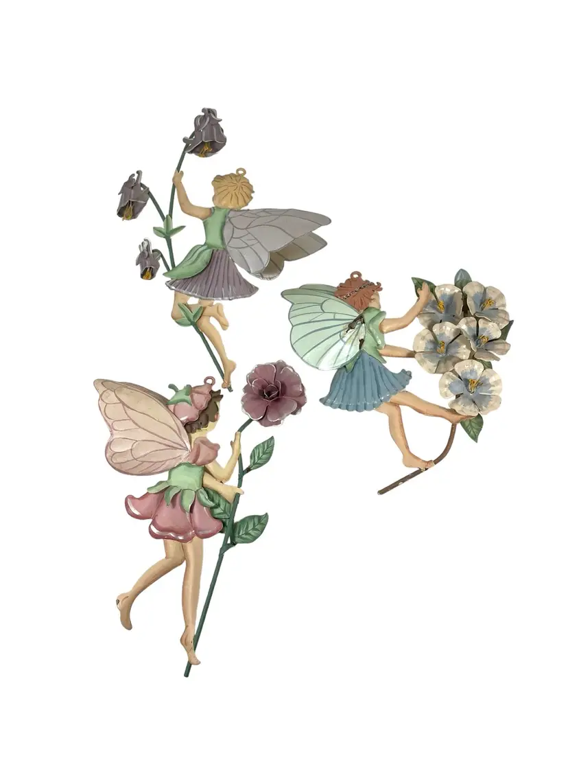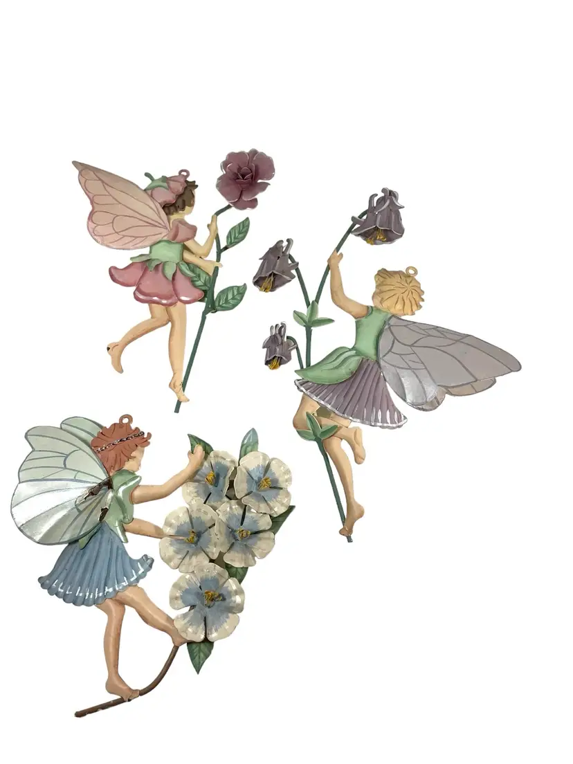 Fairy with blue dress has small areas of paint chips with rust, see pictures. 1 small paint chip on heel of fairy with pink dress. Heights 5.25” - 7.5”. Widths 4.75” - 5.25”.