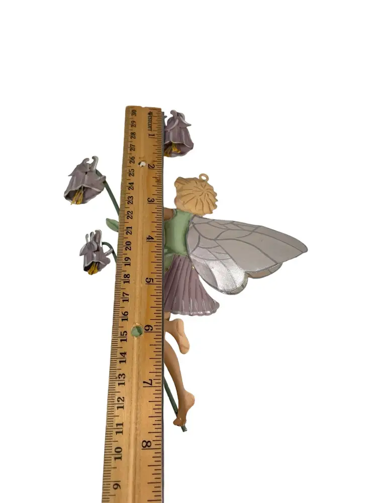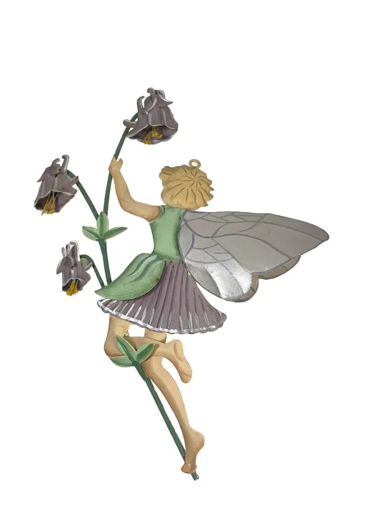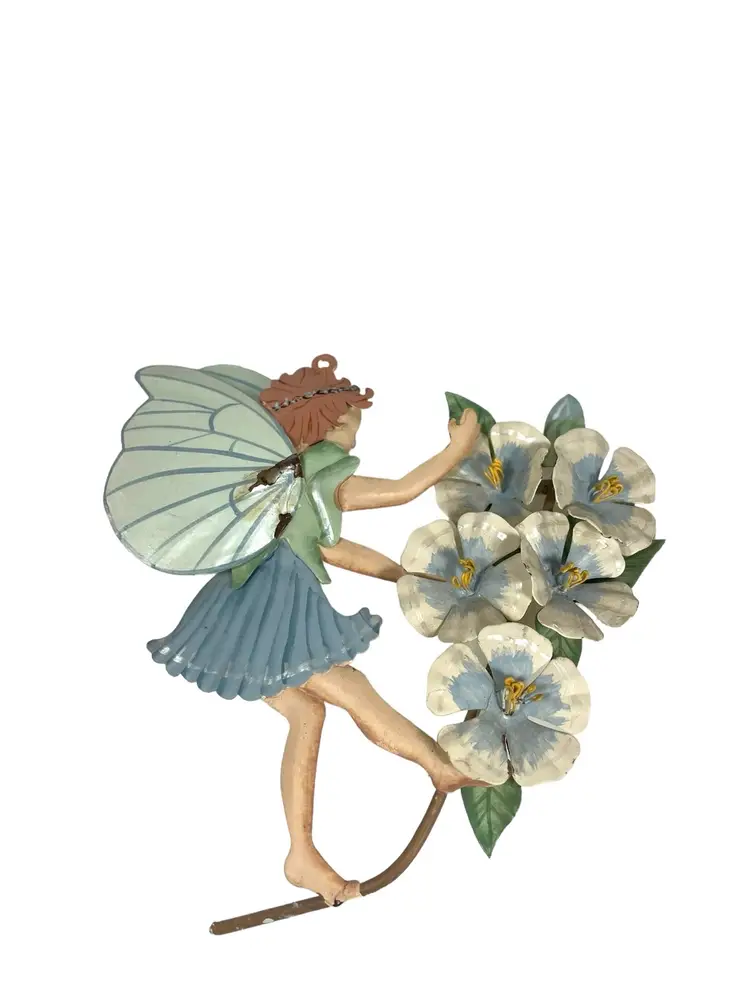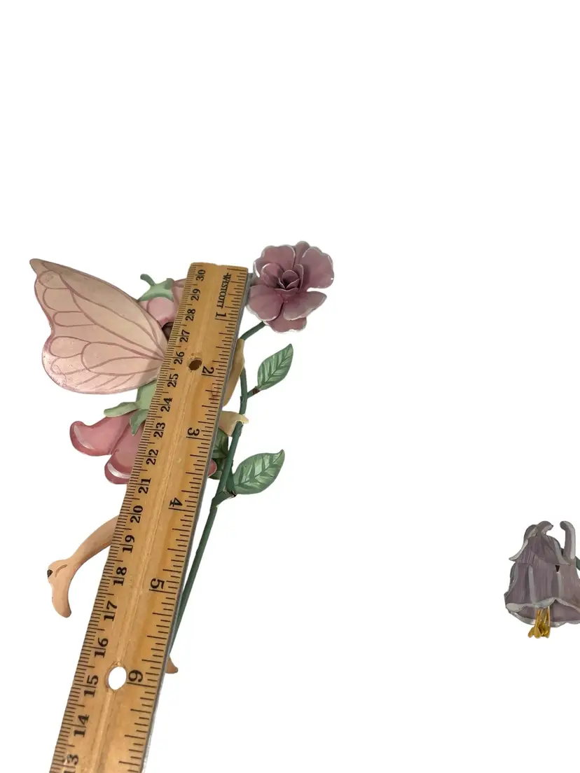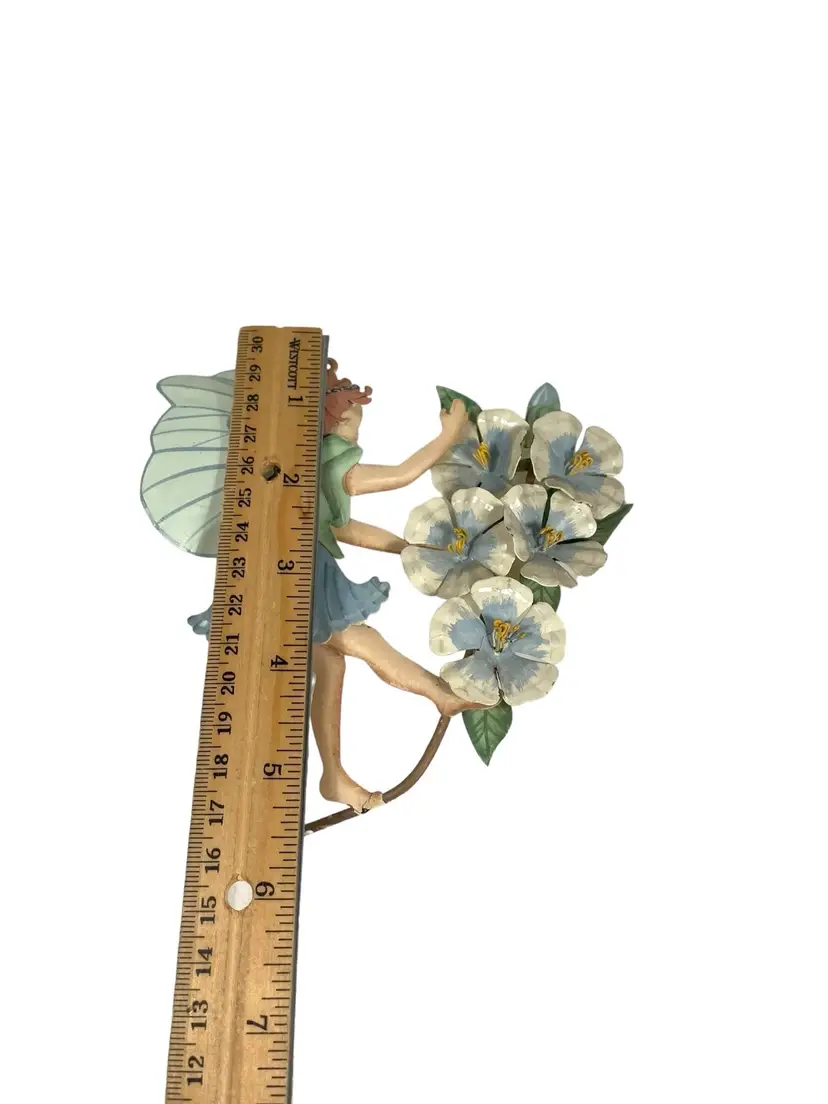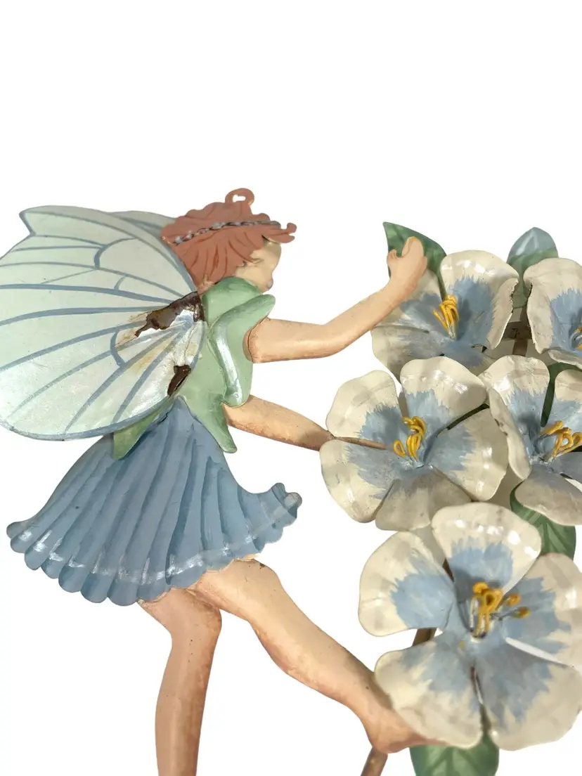 Fairy with blue dress has small areas of paint chips with rust, see pictures. 1 small paint chip on heel of fairy with pink dress. Heights 5.25” - 7.5”. Widths 4.75” - 5.25”.