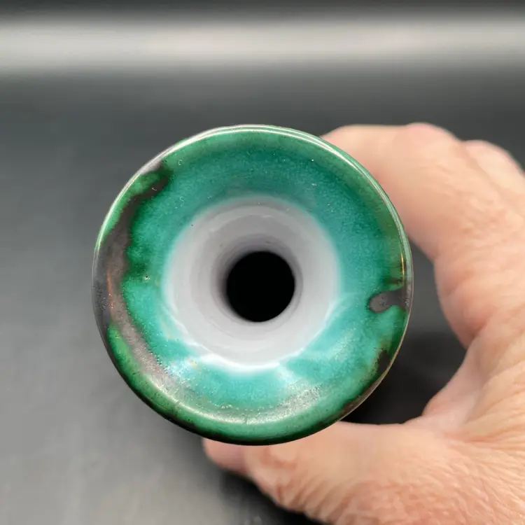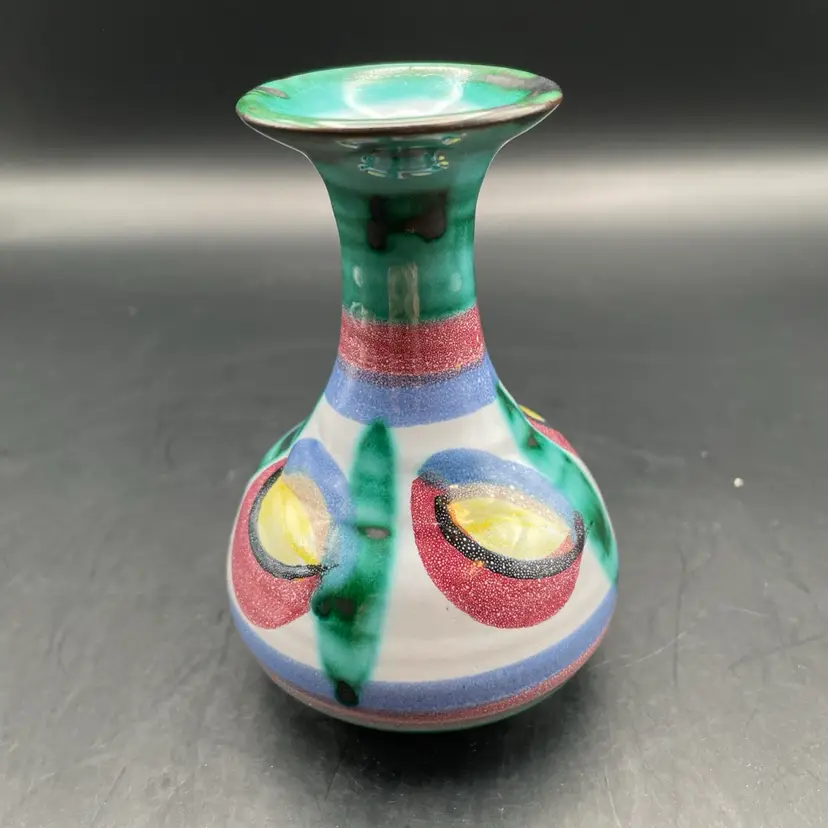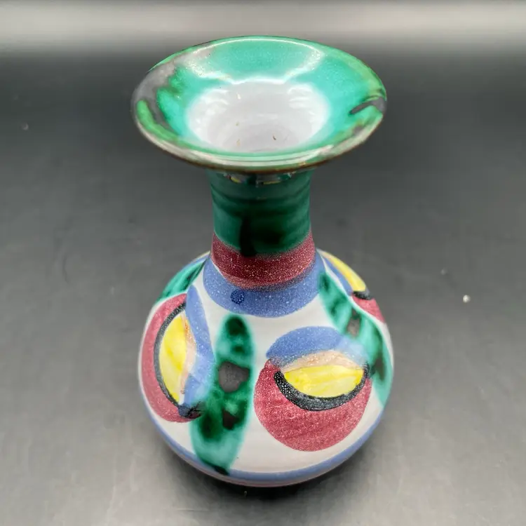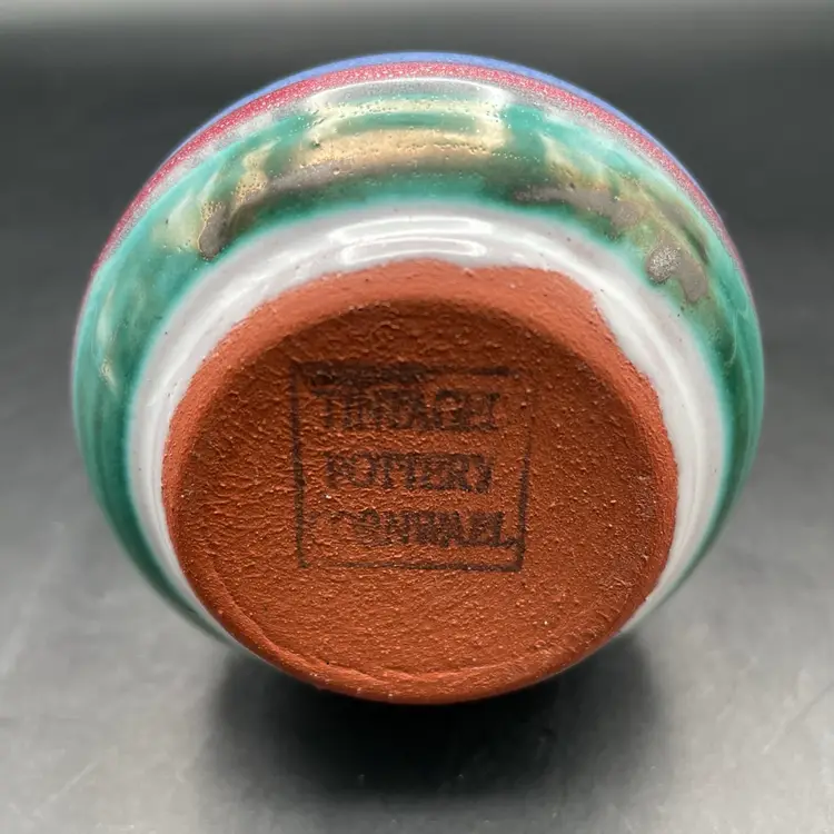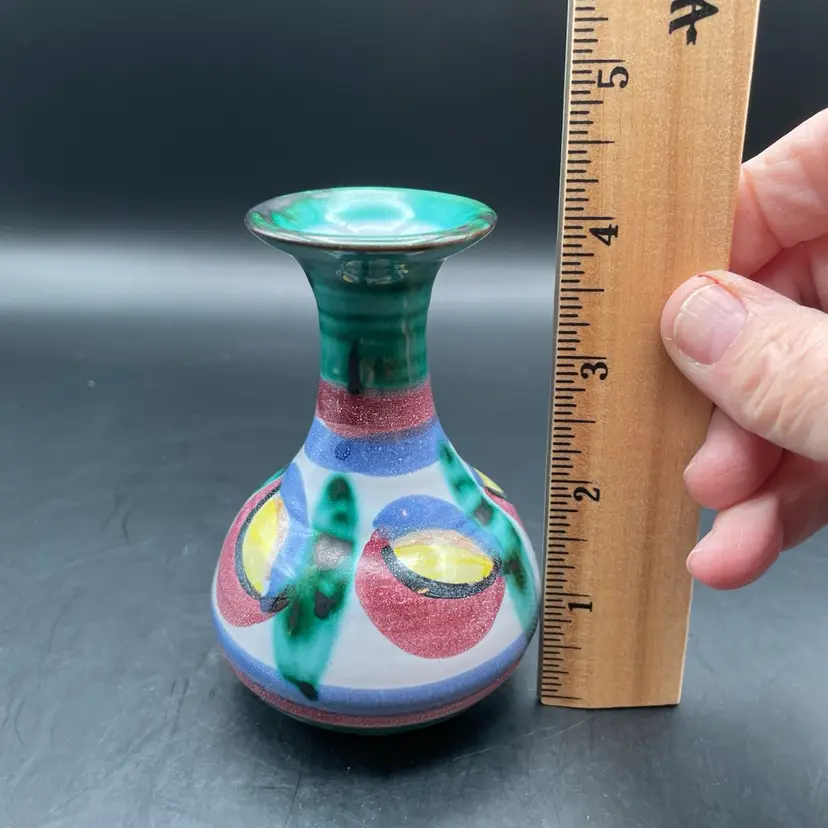 Approximately 4” tall x 3” dia. Colorful terra cotta vase. No chips or cracks.