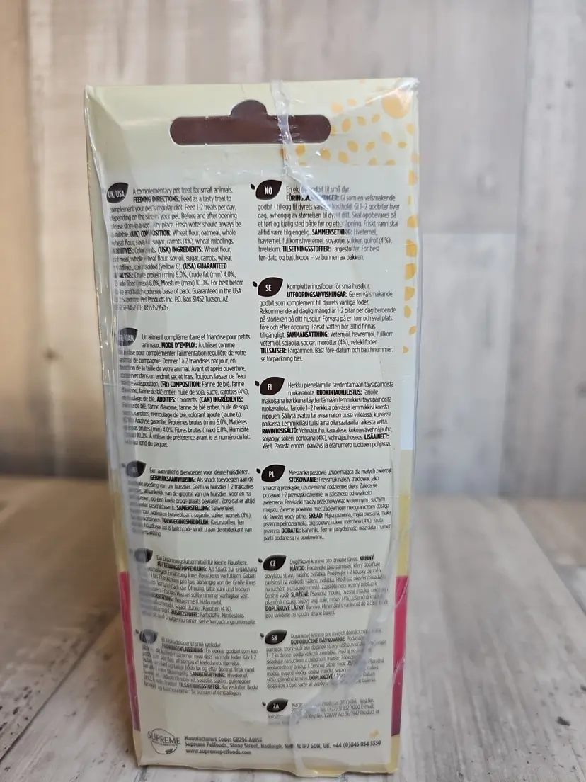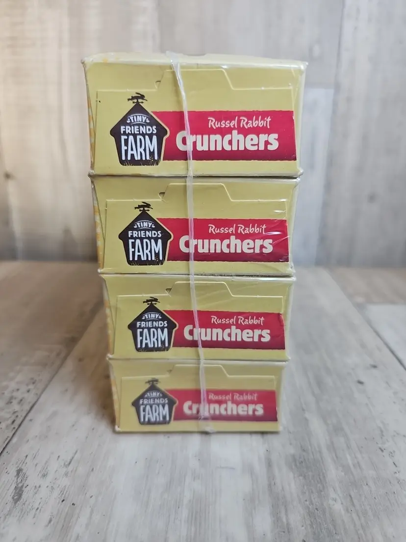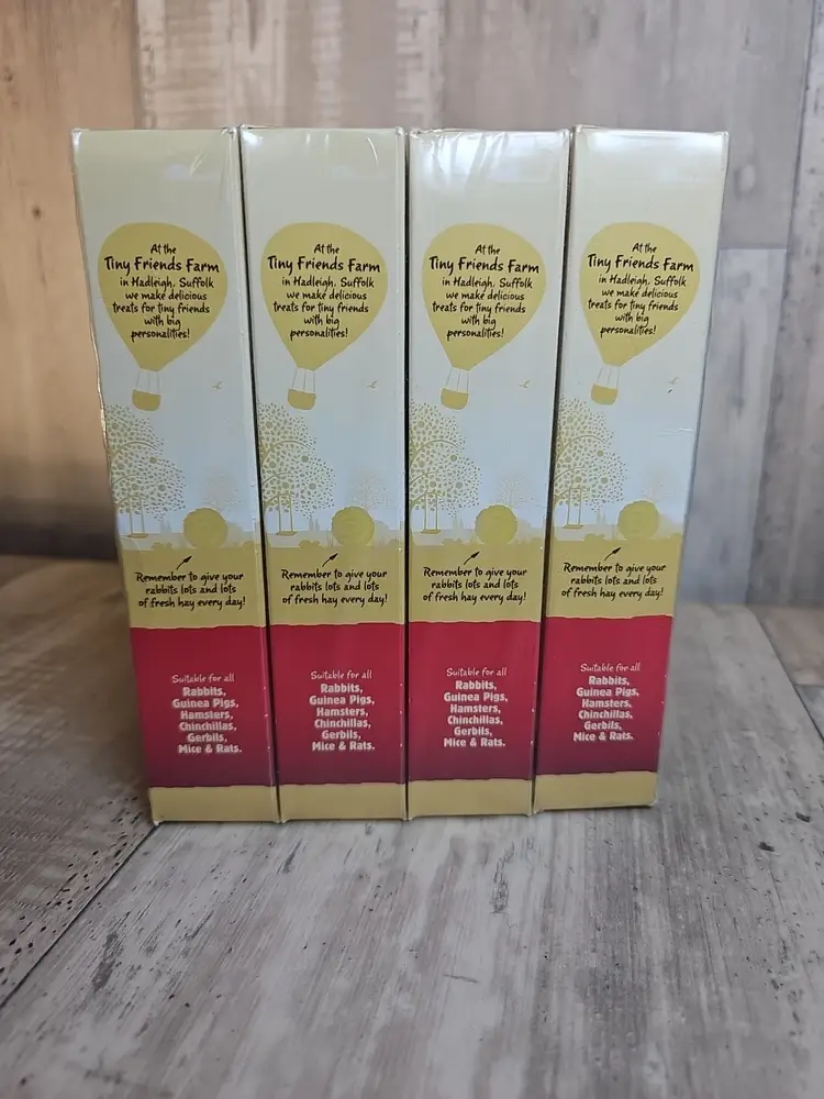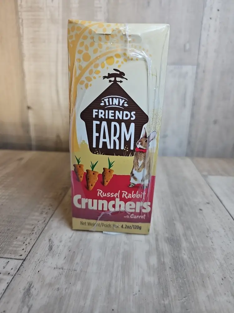 You're purchasing a 4-pack of Tiny Friends Farm Russel Rabbit Crunchers with Carrot, each box containing 4.2 oz (120g) of delicious treats for your furry friends. These treats are specially crafted at the Tiny Friends Farm in Hadleigh, Suffolk, with big personalities in mind!