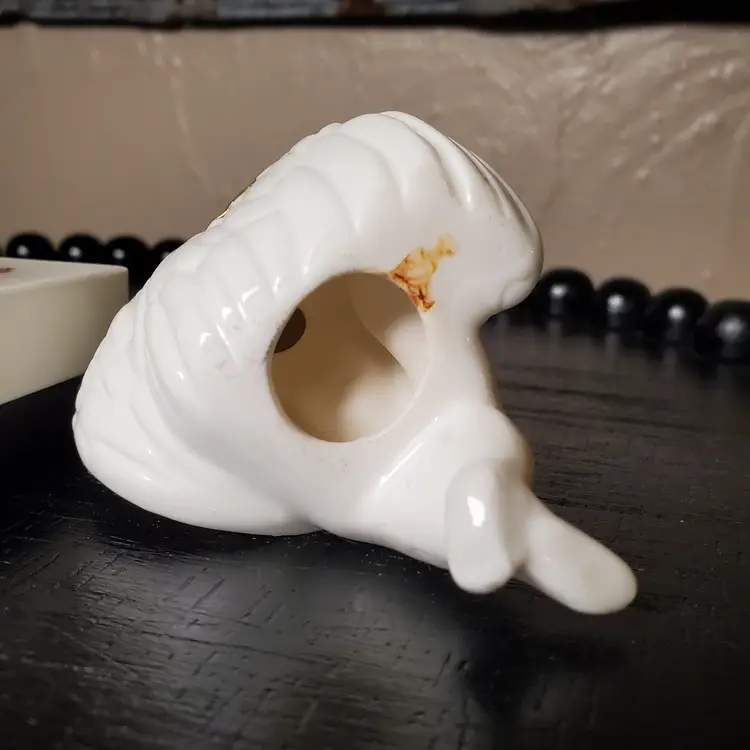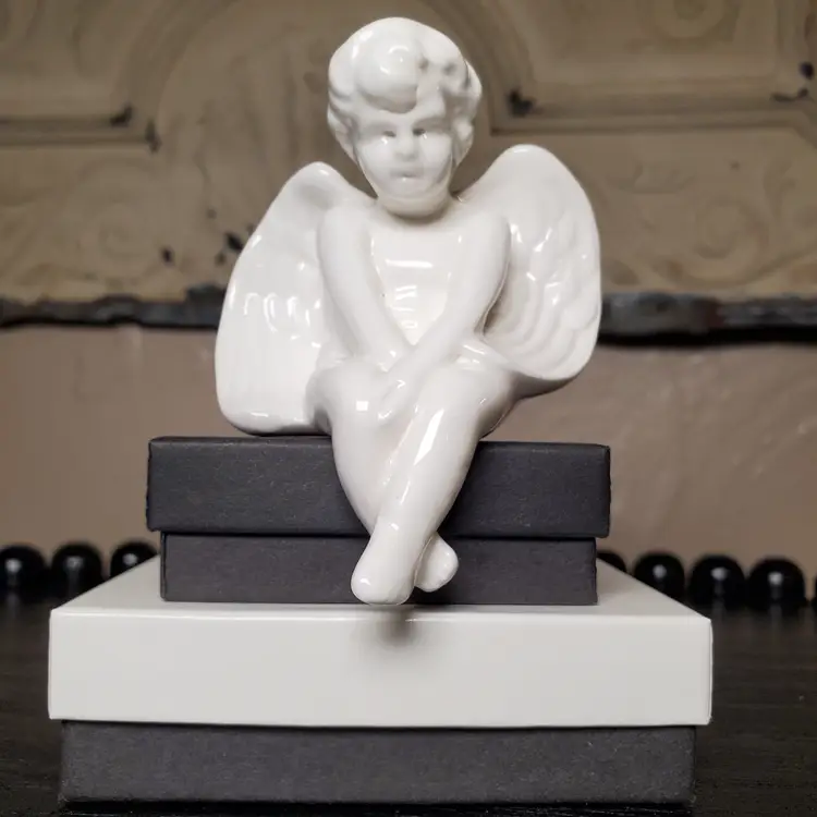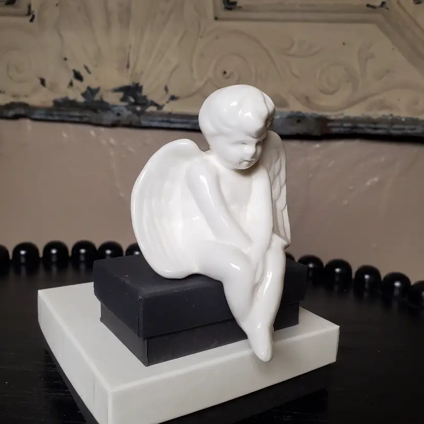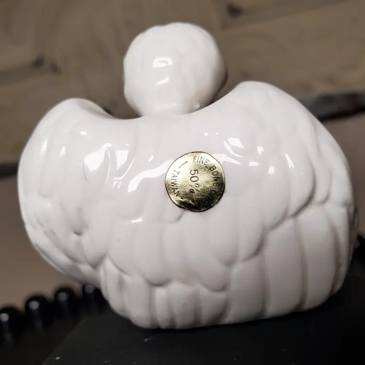 This tiny little cherub looks so sweet perched upon books or any other surface. Marked 50% fine bone china. Taiwan. 3 1/4" x 2 1/2".