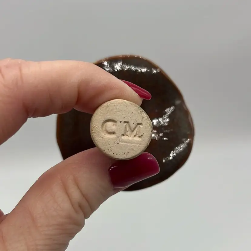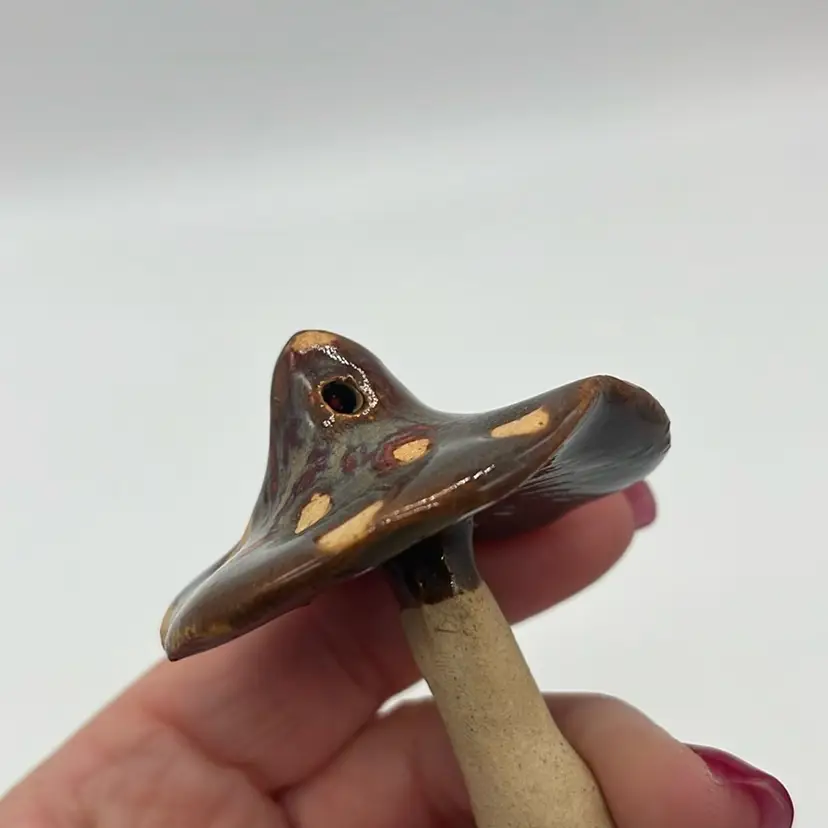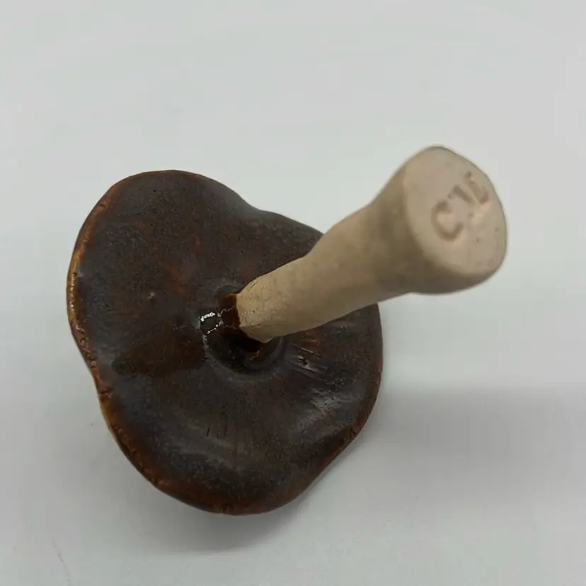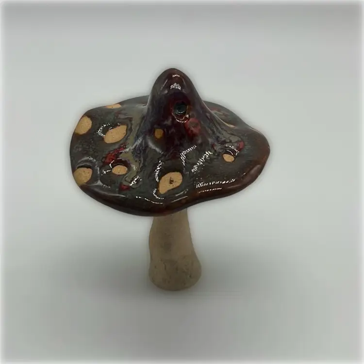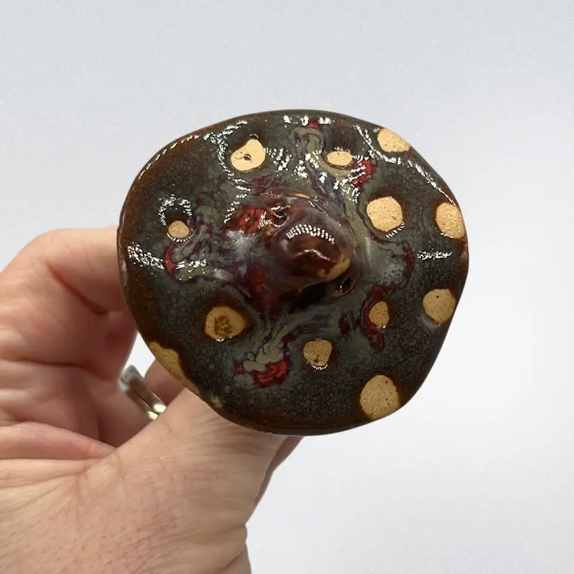 Adorable mushy with slipped glaze on top! Shows some deep reds coming through. Marked CM on the bottom. Little hole but done intentional. Approx. 2.5” h x 2”w