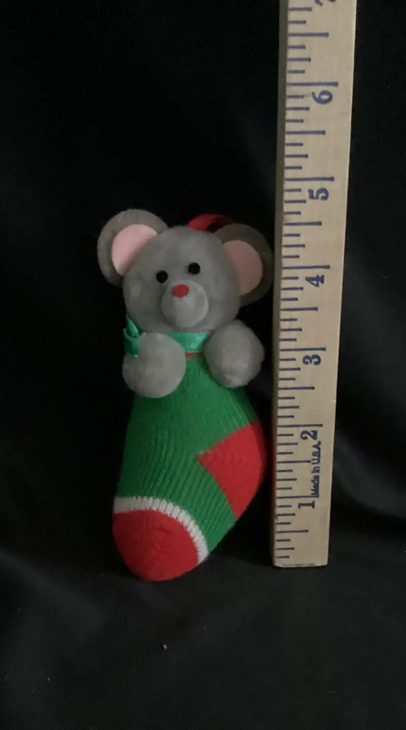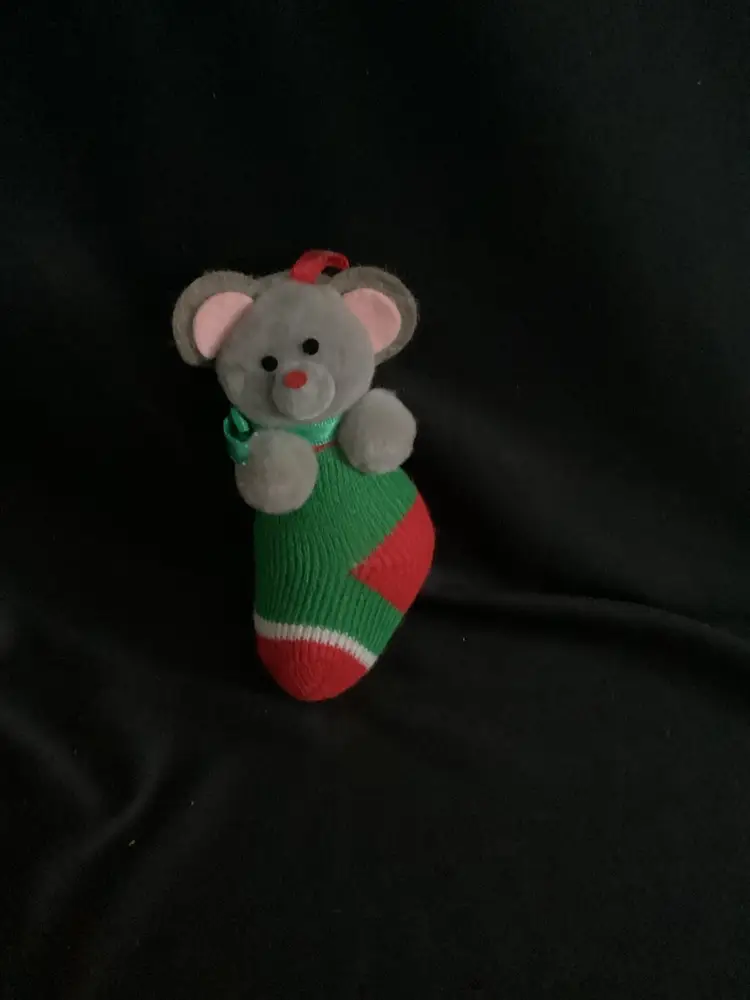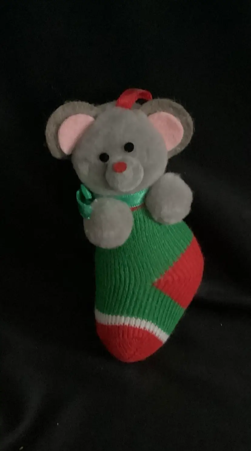 Small gray plush teddy bear in a Christmas stocking - ornament 4 1/2” high Vintage