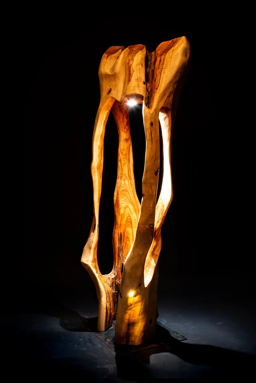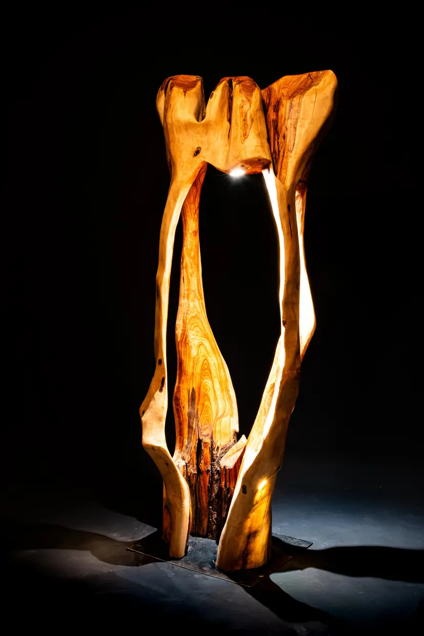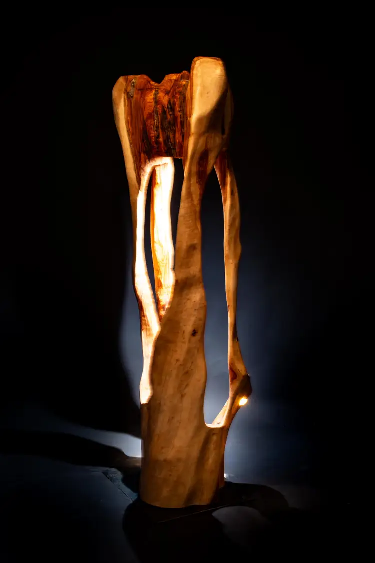 Each piece begins as a single log or cross-section—often reclaimed locally—and is transformed through a slow, hands-on process of carving, burning, and refinement. Light is then integrated into the form, revealing hidden structures, depth, and movement within the wood itself.