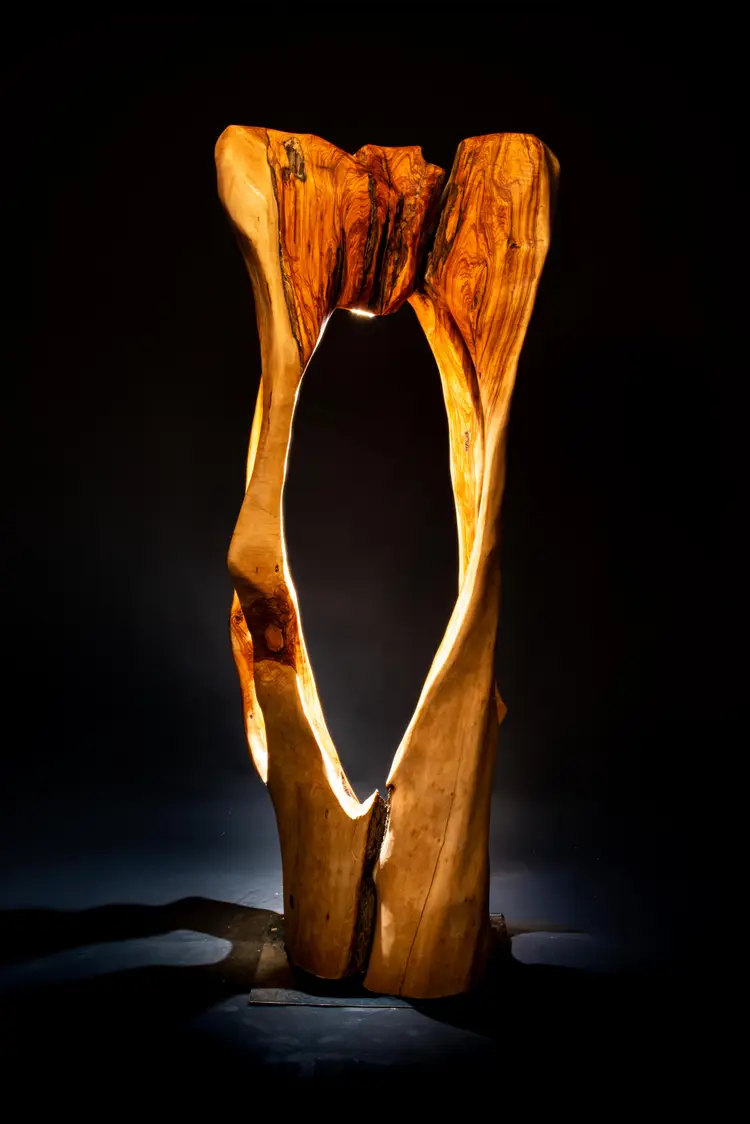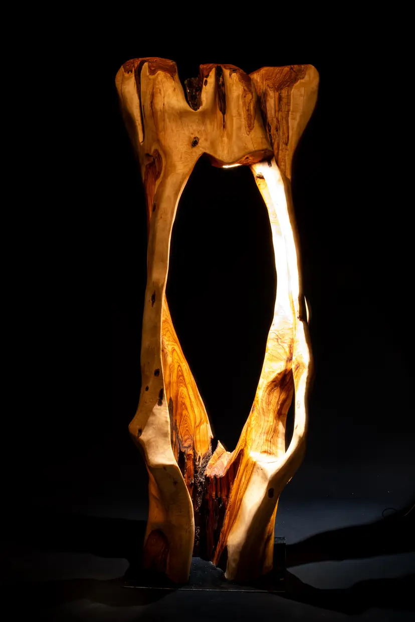 Wind-carved exterior ridges, age-darkened grain, and naturally formed internal chambers define the form. Rather than concealing these features, the sculpture preserves and frames them, allowing the material’s history to remain structurally and visually dominant. When illuminated, light descends through the olive’s interior voids, activating layers of dense heartwood and revealing a deep, golden warmth characteristic of mature olive.