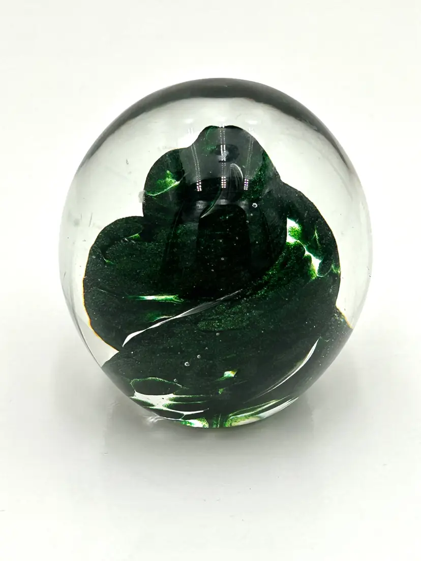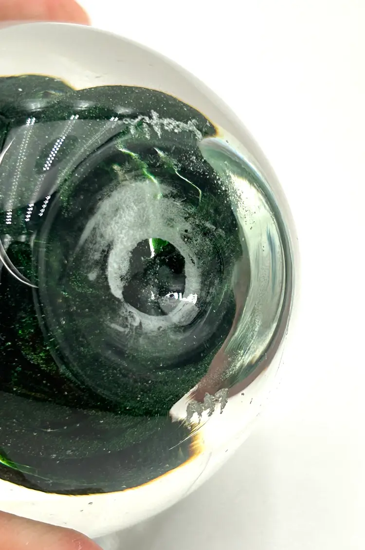 Clear glass with a deep green sparkly swirl in the center paperweight. It is signed on the bottom and appears to say Titan and 1997.