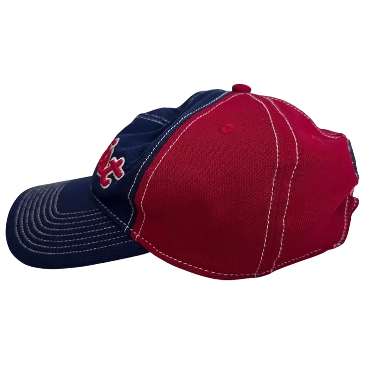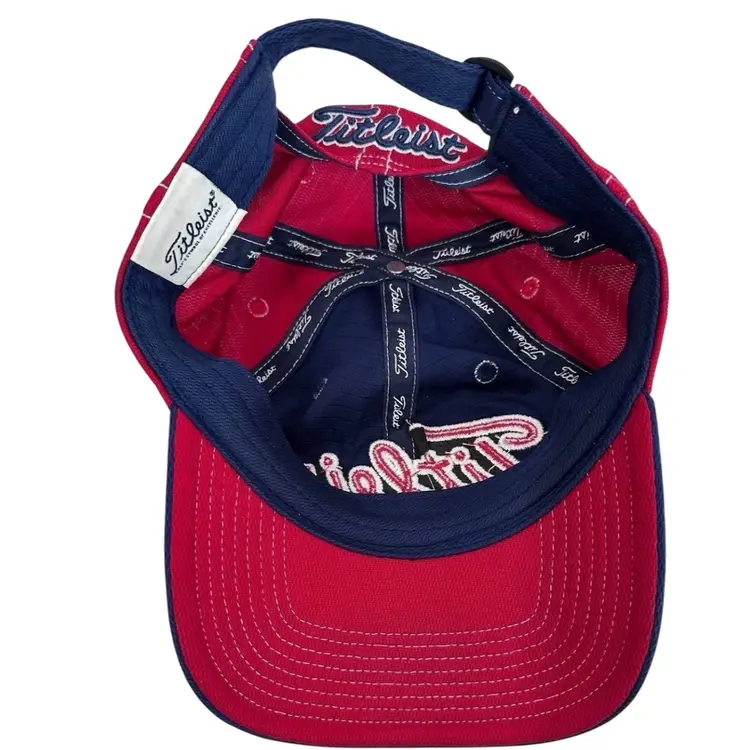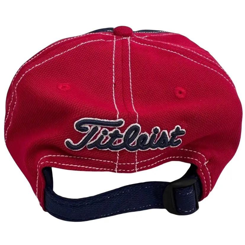 The Titleist Performance Pique Golf Hat is a unisex red and blue adjustable hat designed for golf enthusiasts. Made from a blended fabric of polyester, spandex, and cotton, this lightweight hat is perfect for all seasons and features embroidered accents and a logo. The hat is ideal for both activewear and casual occasions, and its adjustable design ensures a comfortable fit for everyone. With the iconic Titleist brand and sporty theme, this golf hat is a stylish accessory for any golfer's wardrobe.
