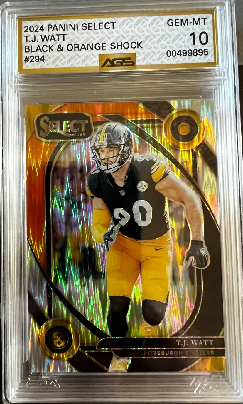 Snag this T.J. Watt Black & Orange Shock card from the 2024 Panini Select series. A gem for any Steelers fan or card collector.
