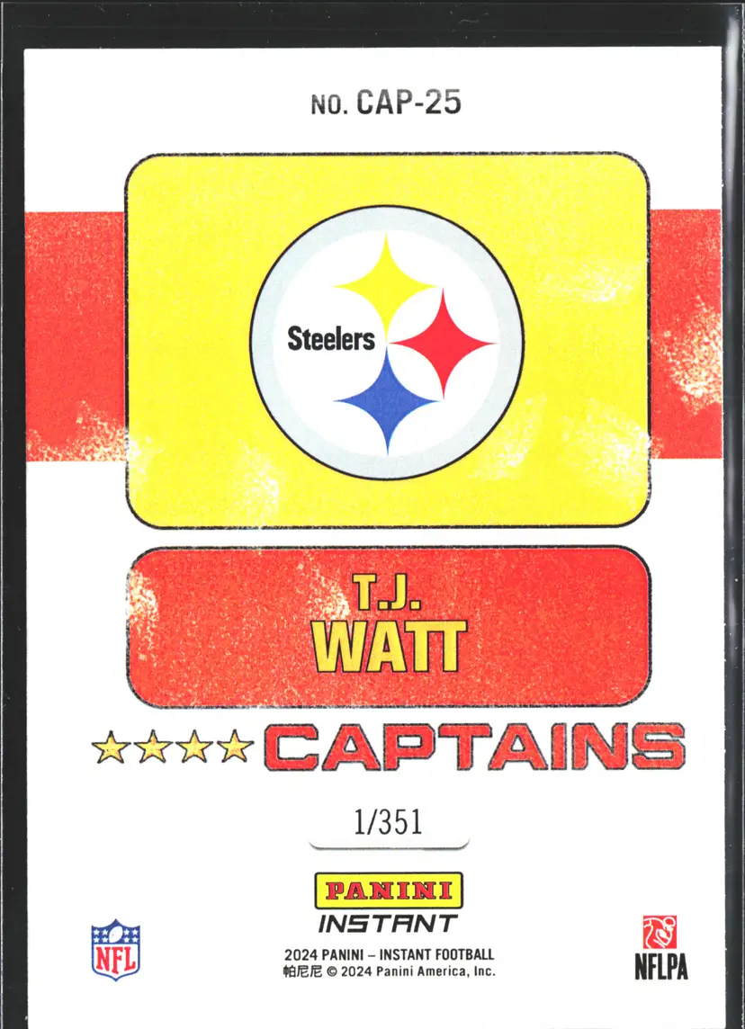 1st time buyer? Get $5 Off with code DISTRICT5 at checkout! Card as shown. All cards $20 and under ship PWE via lettertrackpro [https://www.letter-track.com/registerap.asp?AFID=8757] Sport: Football Set: 2024 Panini Instant NFL Manufacturer: Panini Features: Limited Edition, Serial Numbered Season: 2024 Parallel/Variety: Limited Player/Athlete: TJ Watt, T.J. Watt Type: Sports Trading Card Autographed: No League: National Football League (NFL) Card Condition: Near Mint or Better Material: Card Stock Year Manufactured: 2024 Original/Licensed Reprint: Original Vintage: No Graded: No Team: Pittsburgh Steelers Country/Region of Manufacture: United States