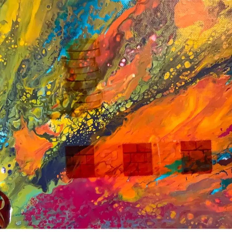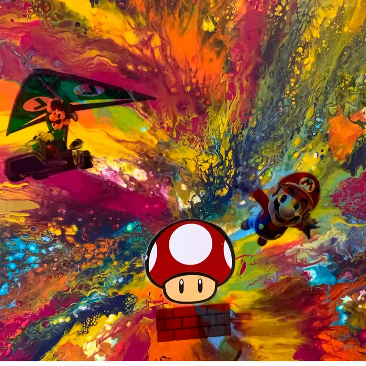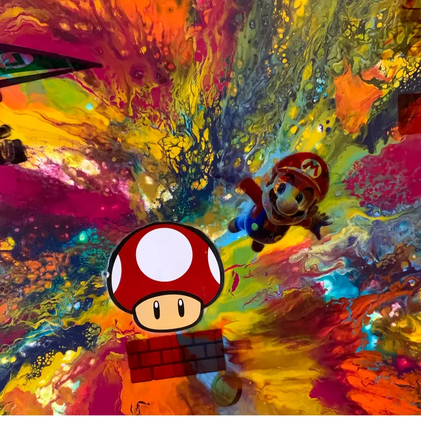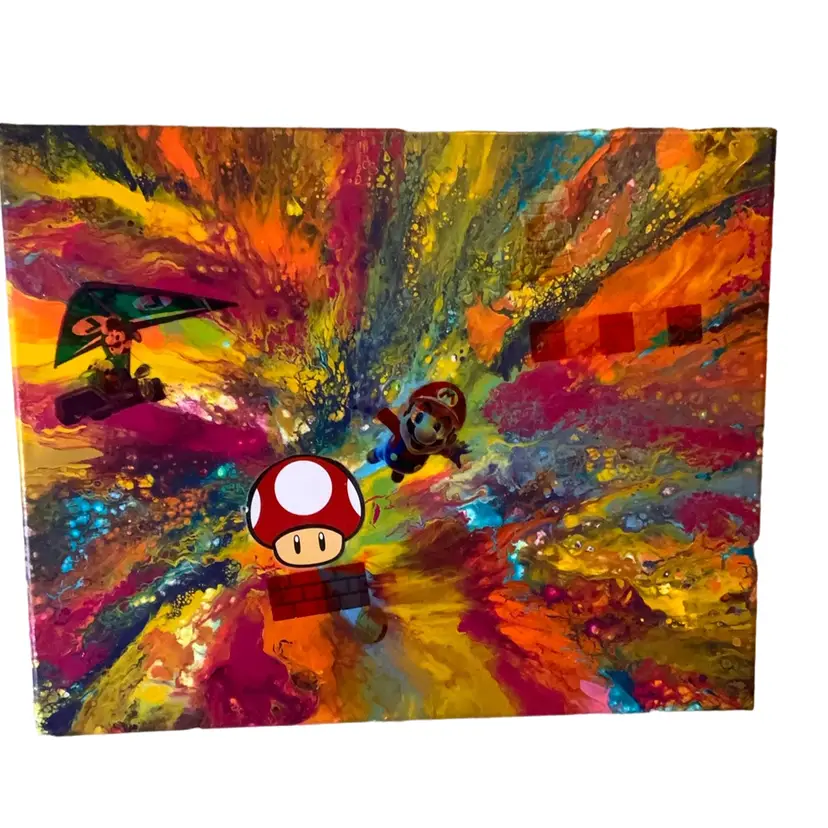 Mixed media painting on 16”x20” canvas by KingJulianPlays. He is 8 years old. He loves Mario Brothers games and movies. Julian is my Art Studio partner. We collaborate on these paintings.