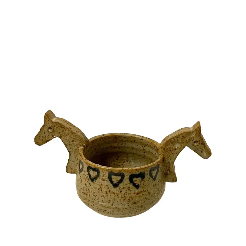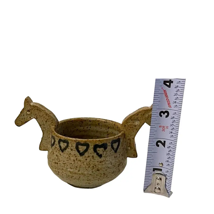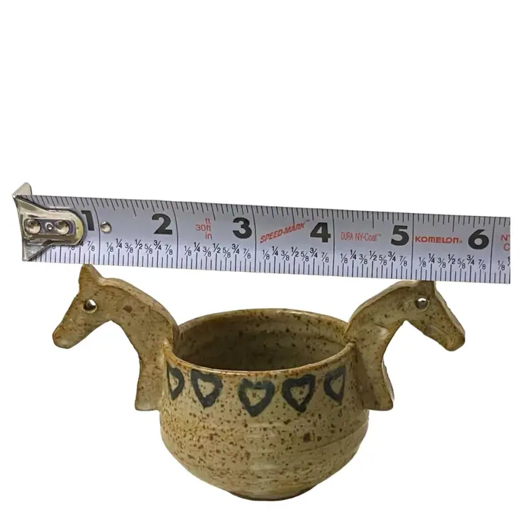 Tokheim studio pottery with horse head handles. Perfect size for a sugar bowl, air plant, or trinket dish signed and dated 1985 on bottom. Condition: Scratch on base, appears to have happened during the manufacturing process. Measurements: Approximately 5 1/2” L x 2 3/8” W x 3 1/4” T. Please see pictures for condition and measurements, as they are a part of the description. Item # 2032 Thank you for looking!