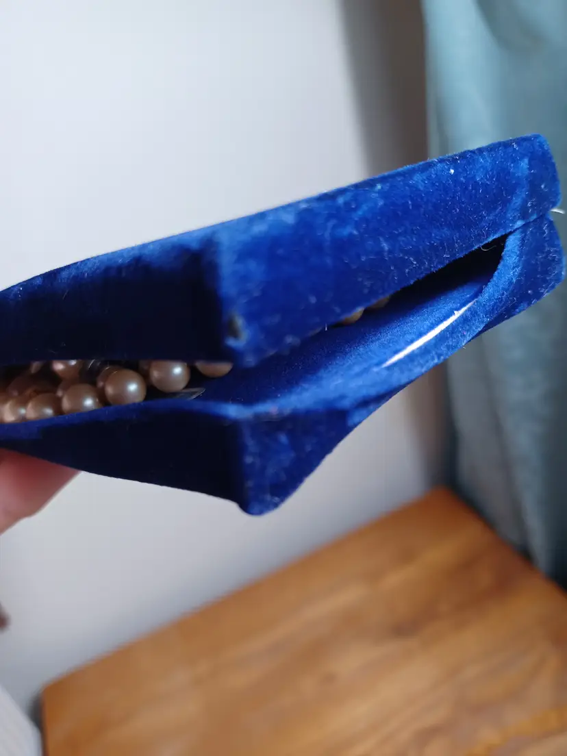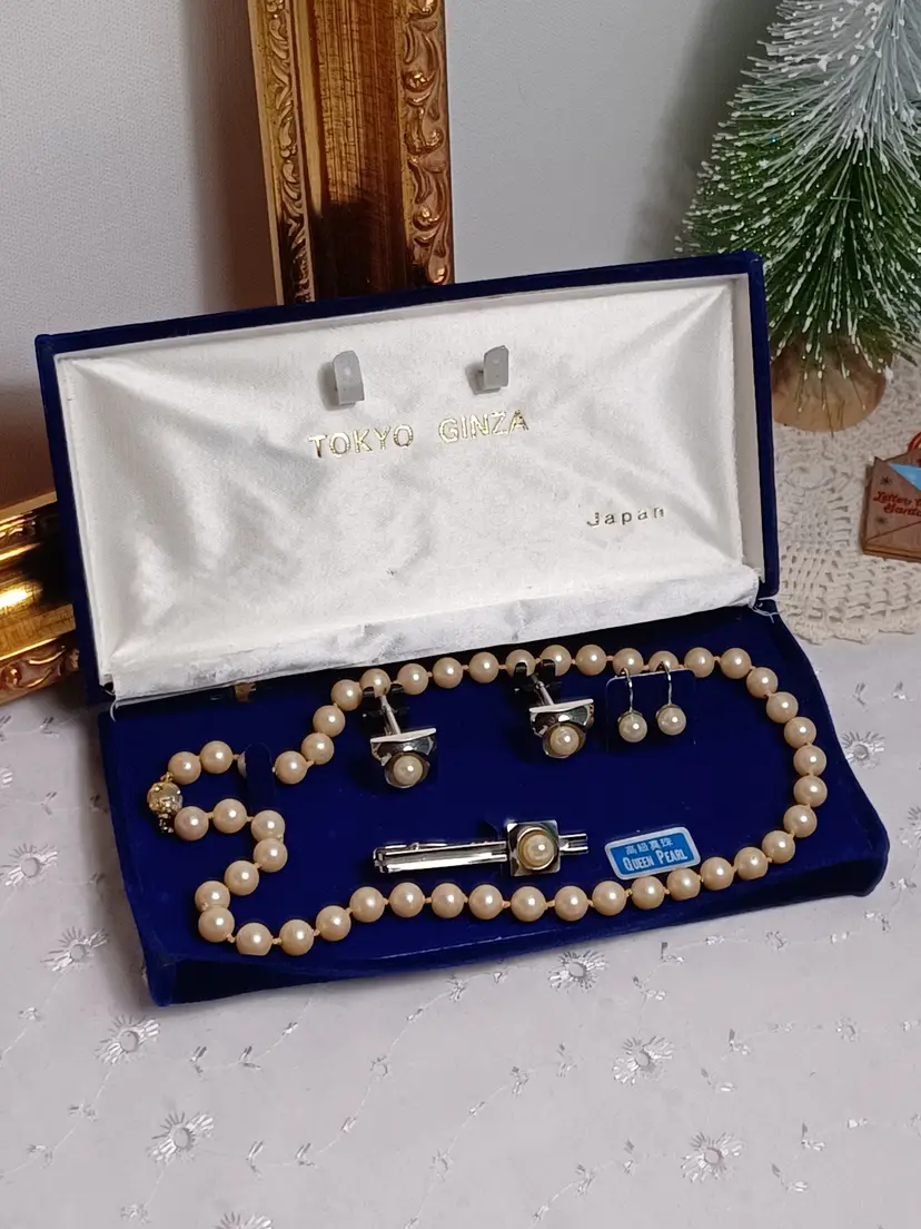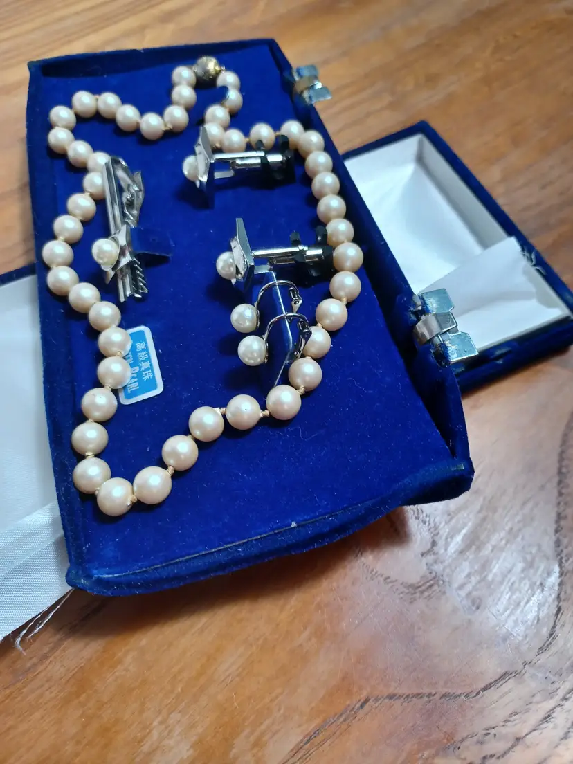 One pearl necklace hand knotted 18" length with gland rhinestone push in clasp Pair of cuff links 3/4" Pair of clip on earrings One tie pin 2 1/2" note Blue velvet box is warped and doesn't close perfectly but in good condition otherwise just a little tlc needed:)