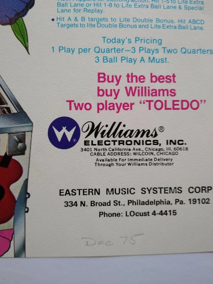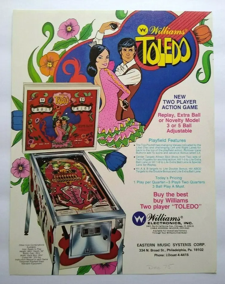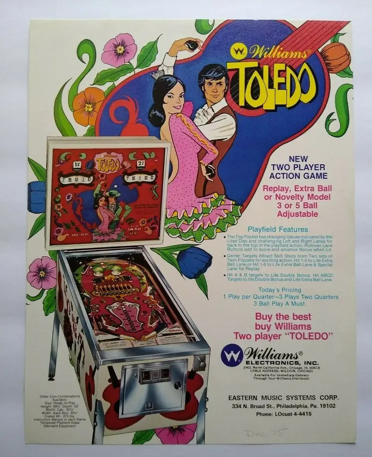 Model: Toledo Original: Pinball Flyer Pinball: Flyer Theme: Spain Modified Item: No Country/Region of Manufacture: United States Year: 1975 Brand: Williams
