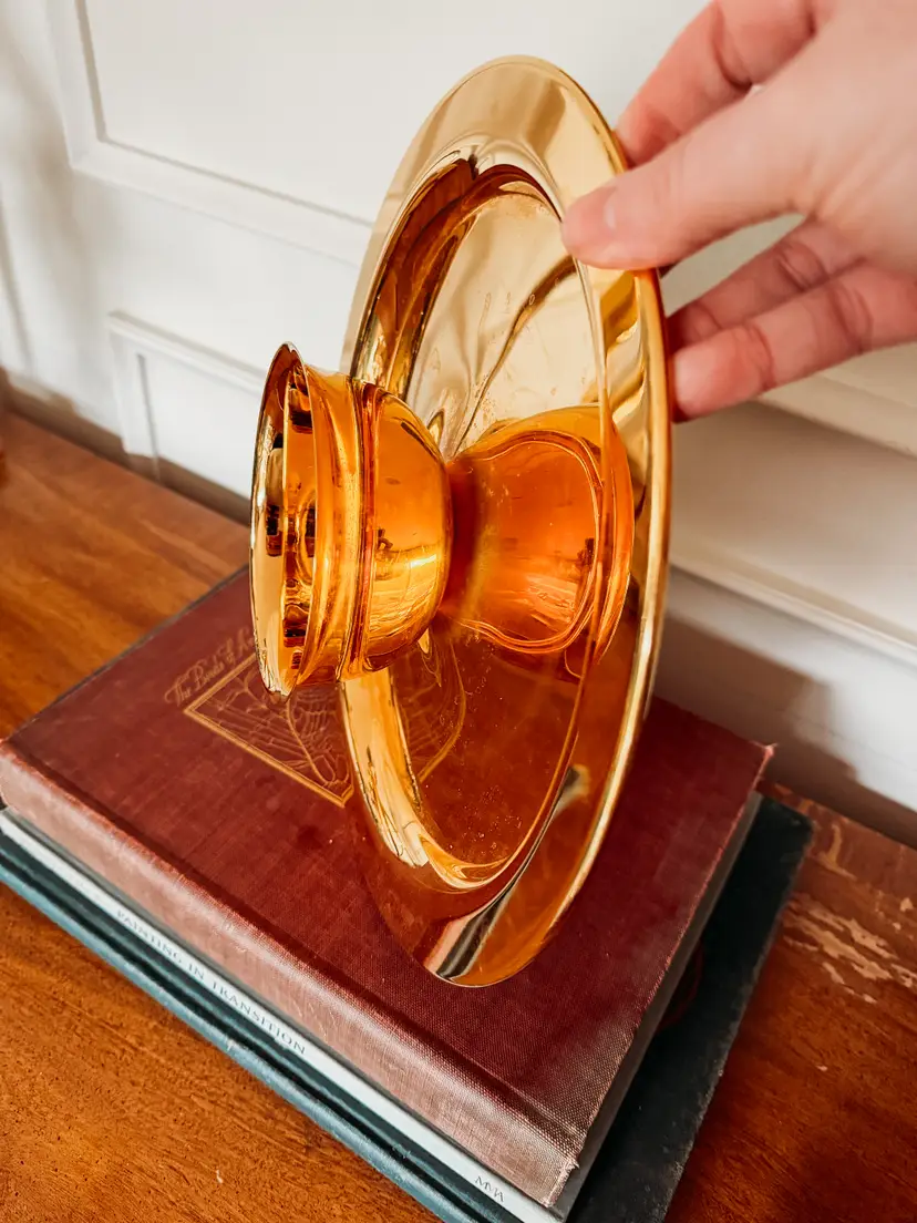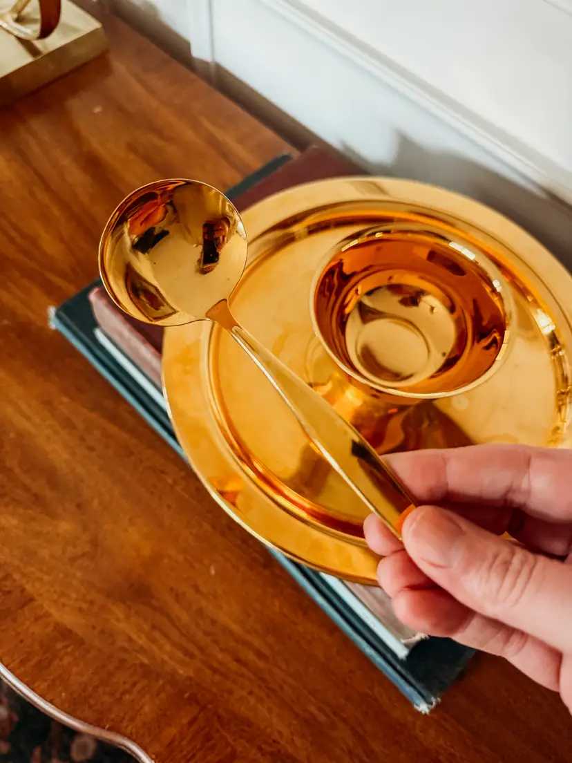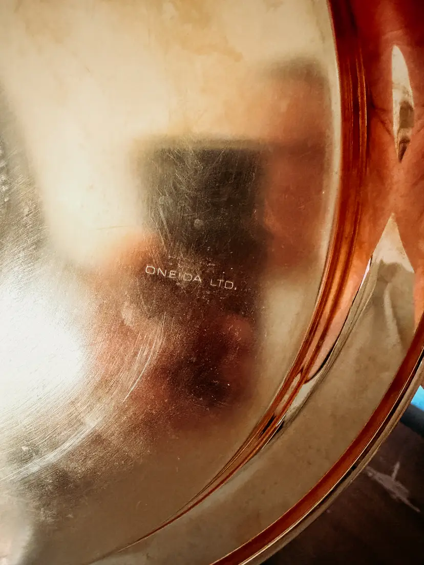 Gold toned metal serving tray with fused bowl from Oneida in their Tolman collection. Comes with a matching ladle which is NOT Oneida. 12.5 diameter