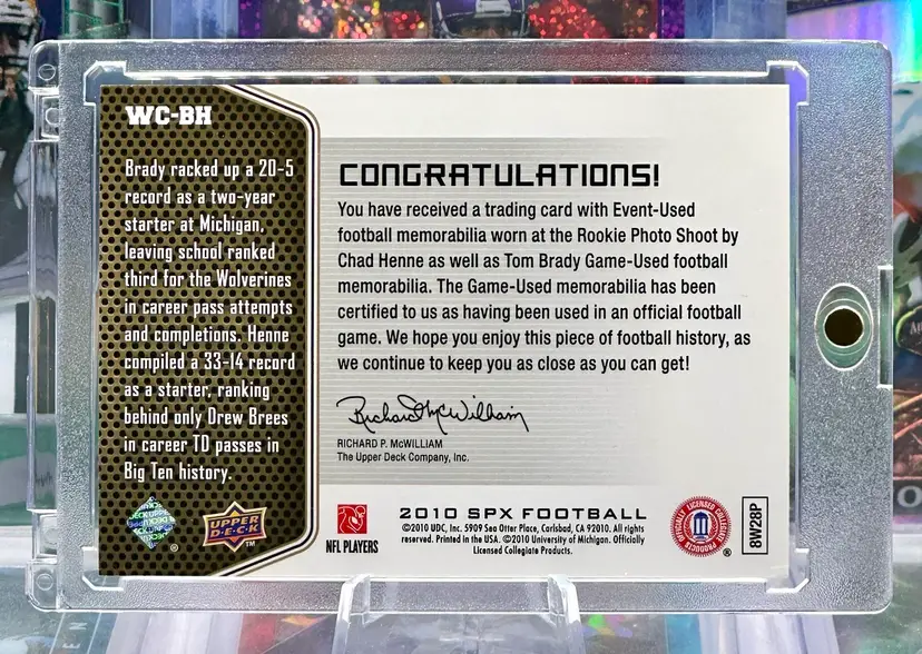 Tom Brady Chad Henne 2010 Upper Deck SPx 10/99 JERSEY # MATCH Dual GAME USED Jersey Patch Mem Memorabilia Relic Material Materials SP Short Print In Wearing Michigan Uniform Uni Insert Parallel University of Michigan Wolverines GO BLUE! New England Patriots Dolphins Rare NCAA NFL Football Card
