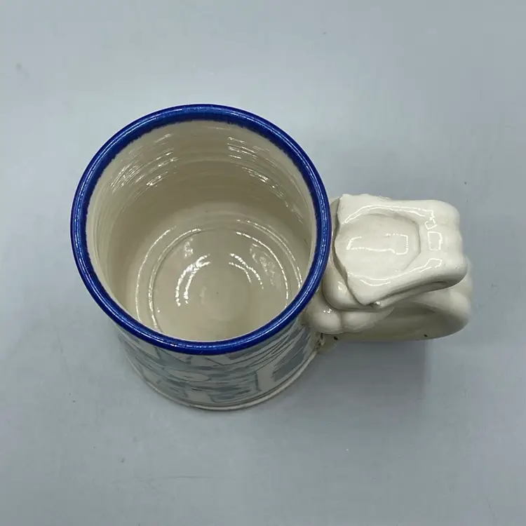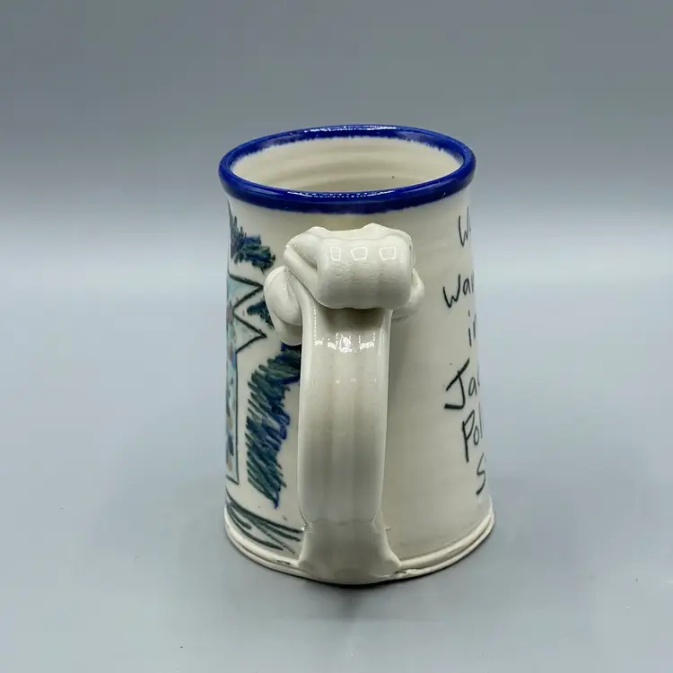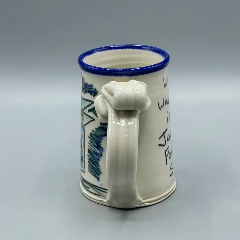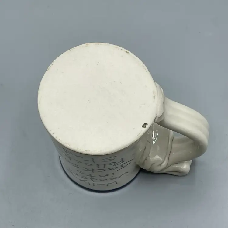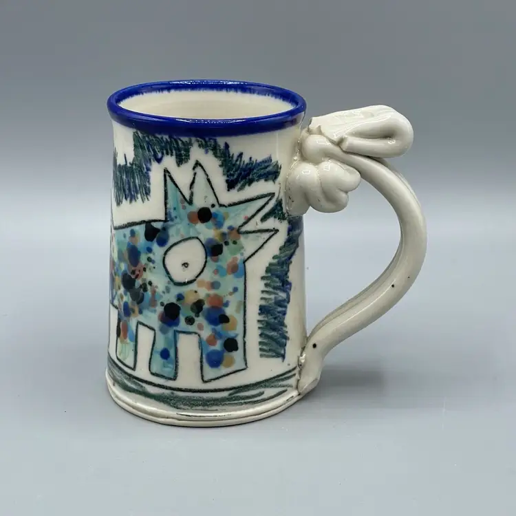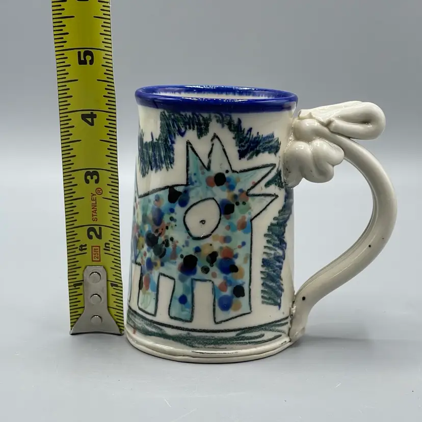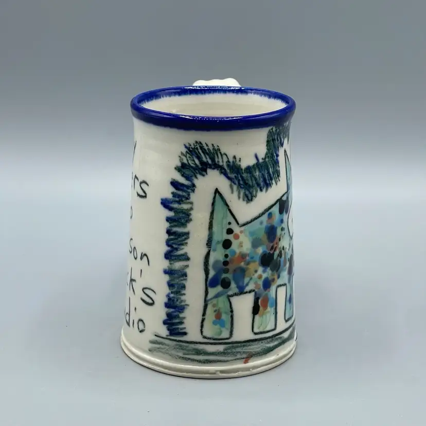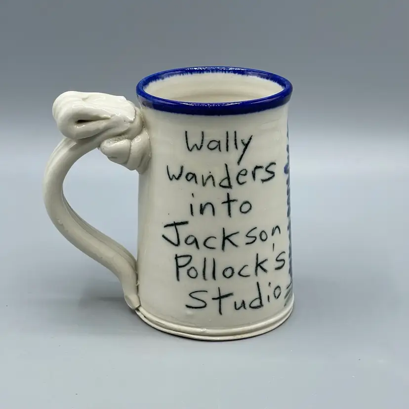 This funny mug series by Tom Edwards follows Wally the dog’s adventures and miss-adventures. This mug depicts Wally splattered in paint after visiting the studio of a modern artist famously known for splattered art pieces. There are no chips or cracks and stands about 4-1/2 inches tall.