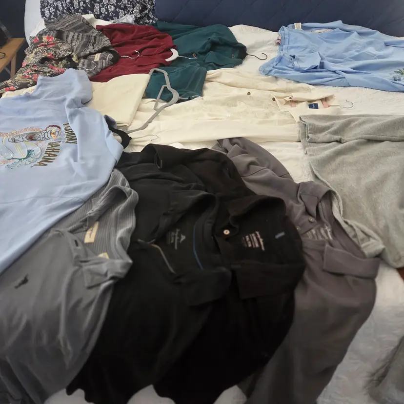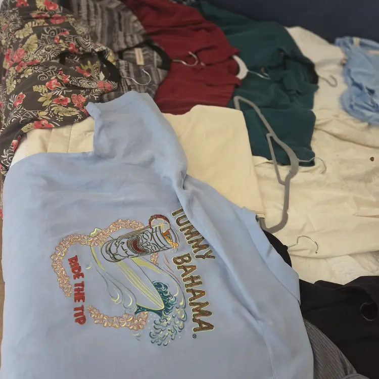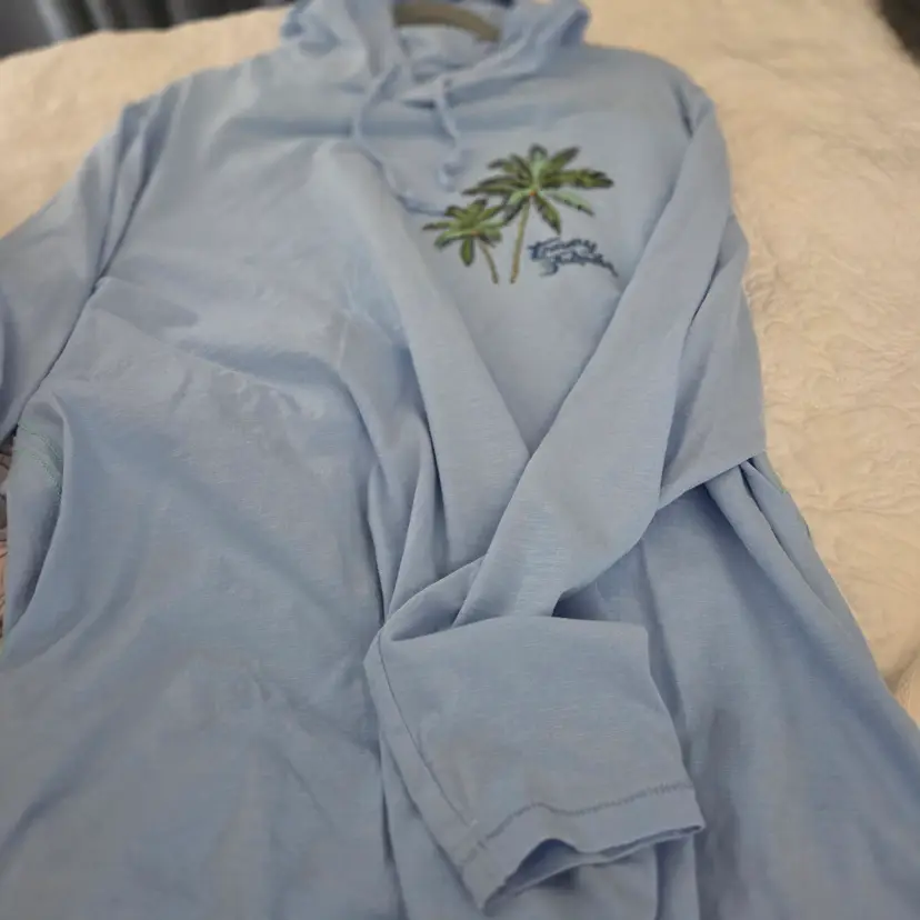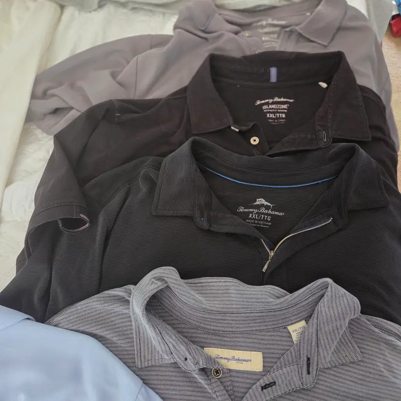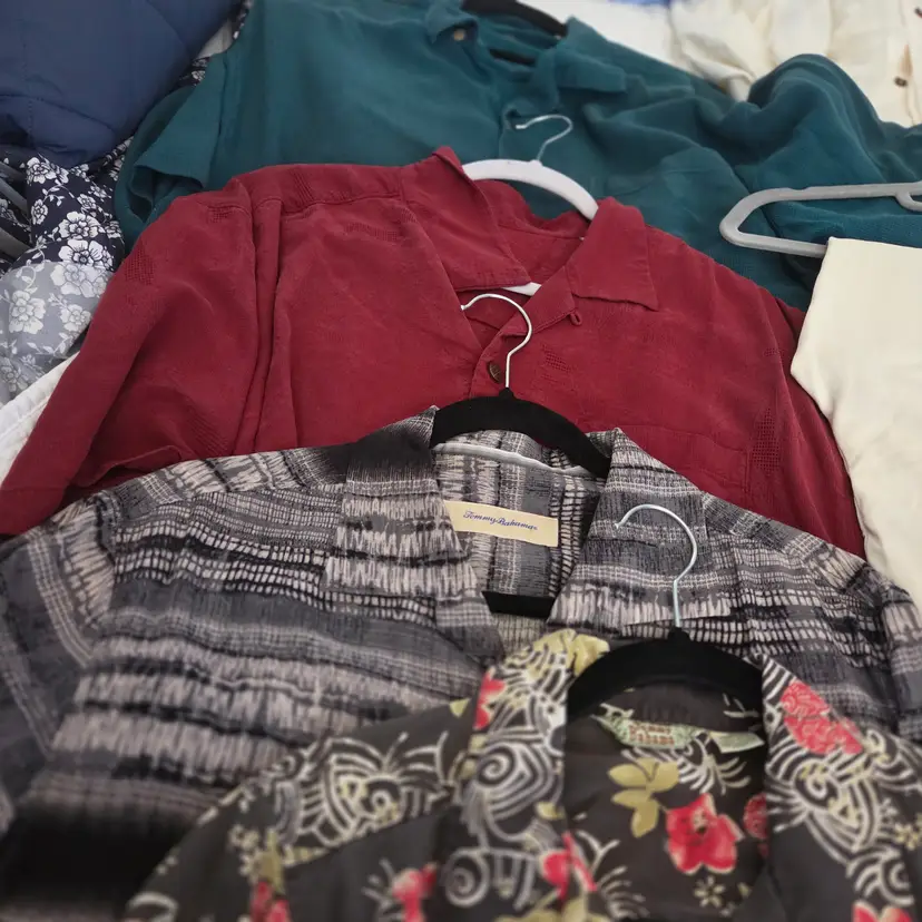 Back hit embroidered piece, embroidered long sleeve hooded tshirt, silk tropical shirts (one boys), 4 polos, silk blend pants, sweaters 1/4 zips 14 pieces. one shirt has a loose corner on a pocket.