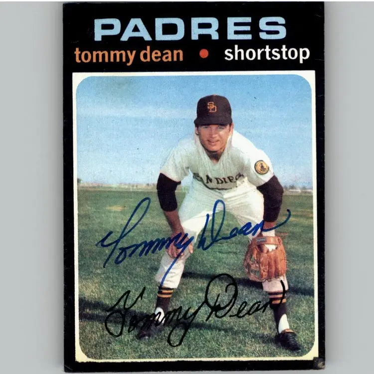Vintage baseball card featuring Tommy Dean of the San Diego Padres, signed by the player himself. A great addition for Padres fans and collectors of autographed sports memorabilia. Your purchase supports Signatures For Soldiers in their mission to help homeless and disabled veterans.