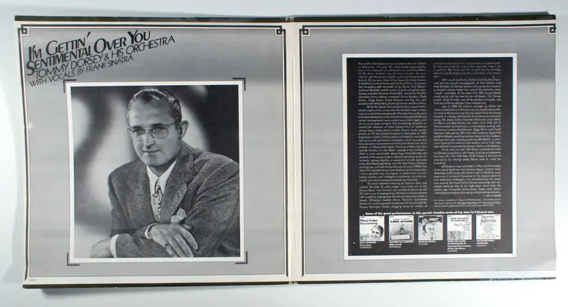 I'm Gettin' Sentimental Over You, by Tommy Dorsey, is a two-LP compilation release that assembles 14 timeless tracks from the band's 1930s and 1940s RCA Victor catalog, with the unique twist of featuring a mature Frank Sinatra re-recording vocals on four of his original hits from that era (This Love of Mine, Be Careful, It's My Heart, Star Dust, and The Song Is You) using the same iconic arrangements, creating a poignant reunion over three decades later. The album opens with the orchestra's signature instrumental I'm Gettin' Sentimental Over You and includes Sinatra's classic wartime ballad I'll Never Smile Again—a massive hit that topped the charts for 20 weeks—alongside lush standards like Sleepy Lagoon and Tea for Two, while fan-favorites among the all-instrumental Side D selections feature the high-energy swing of Boogie Woogie, Royal Garden Blues, and Opus No. 1. Historically significant for bridging the big band era's golden age with its nostalgic revival in the 1970s, the stereo-remastered set preserves the sophisticated Dorsey sound that defined American dance music before the war and launched Sinatra's stardom. Devoted listeners cherish the Sinatra tracks for their emotional depth, evoking the magic of his early days with the band, while the full collection stands as an essential document of swing's enduring legacy.