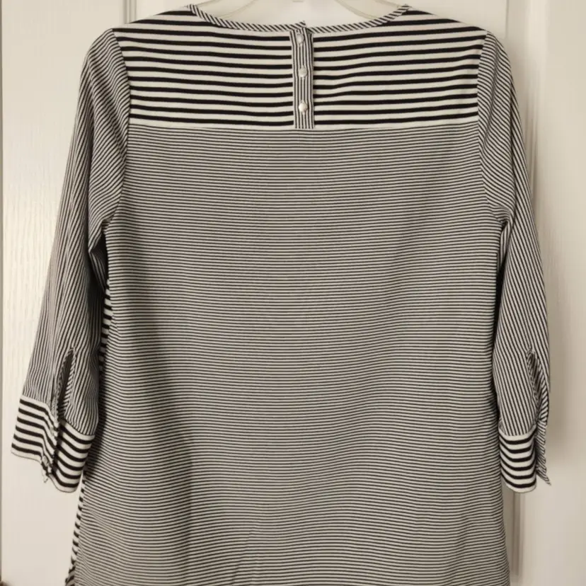 This one is fun and crazy. I'll try to explain it as best as I can. The front has horizontal black and white stripes. The back top of the blouse has the same stripes as the front and has three small buttons. Once you get past the top part, the rest of the back has smaller stripes. The sleeves have the same smaller stripes as the back. The bottom part of the sleeves have the larger stripes like the front of the blouse. It has 3/4 length sleeves. There is a 2 1/2 inch slit on each side. It is 95% polyester and 5% something that I can't read. It is silky soft. In fantastic condition. Measurements: Sleeve length-18 inches Pit to pit-18 inches Length-25 inches