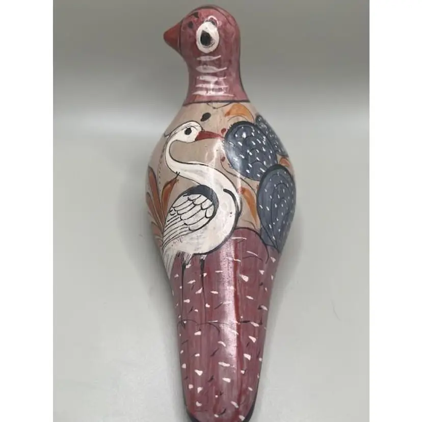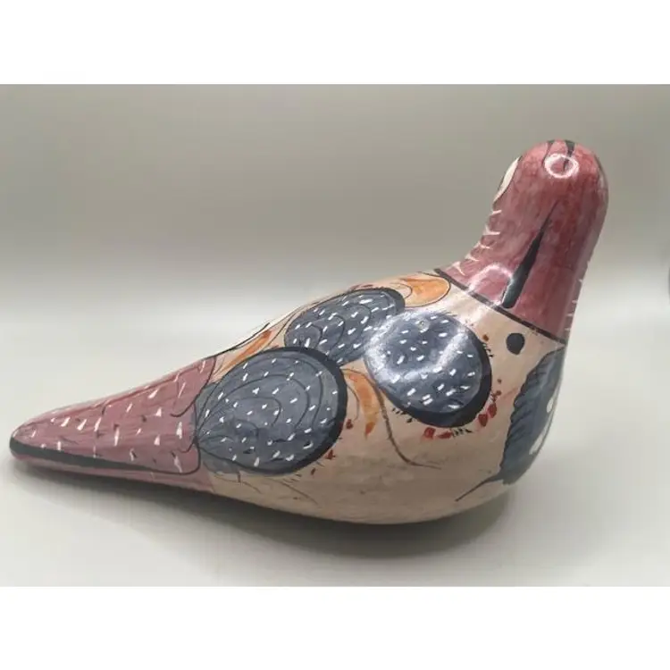 Add a touch of Mexican folk art to your home with this beautifully hand-painted ceramic dove figurine. Featuring intricate designs and vibrant colors, it's perfect for any decor. Measures approximately 7 inches long.