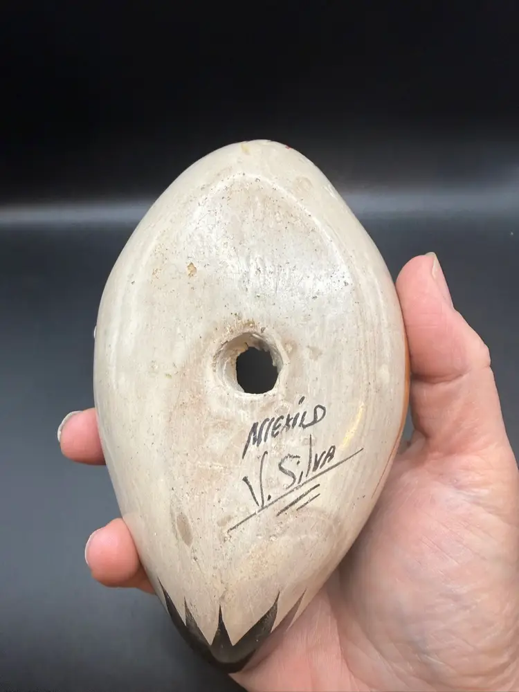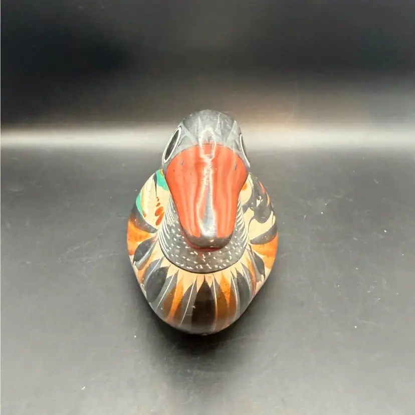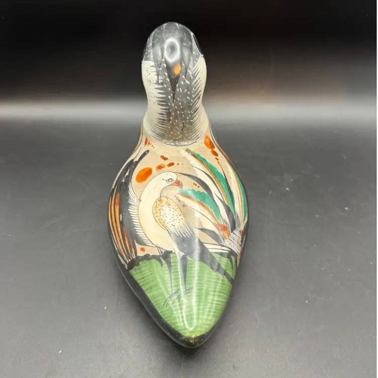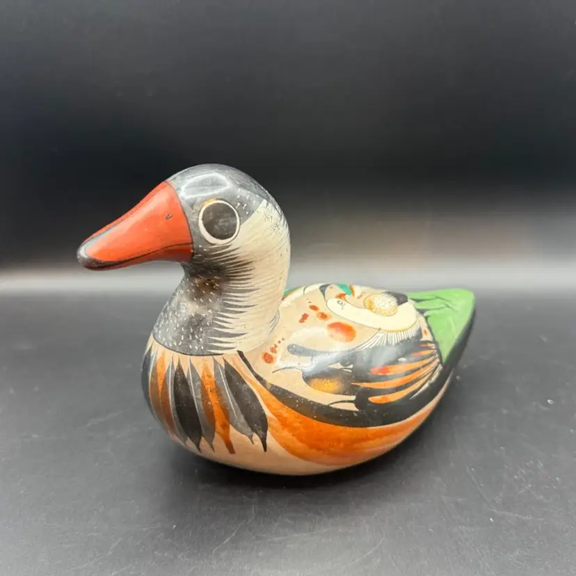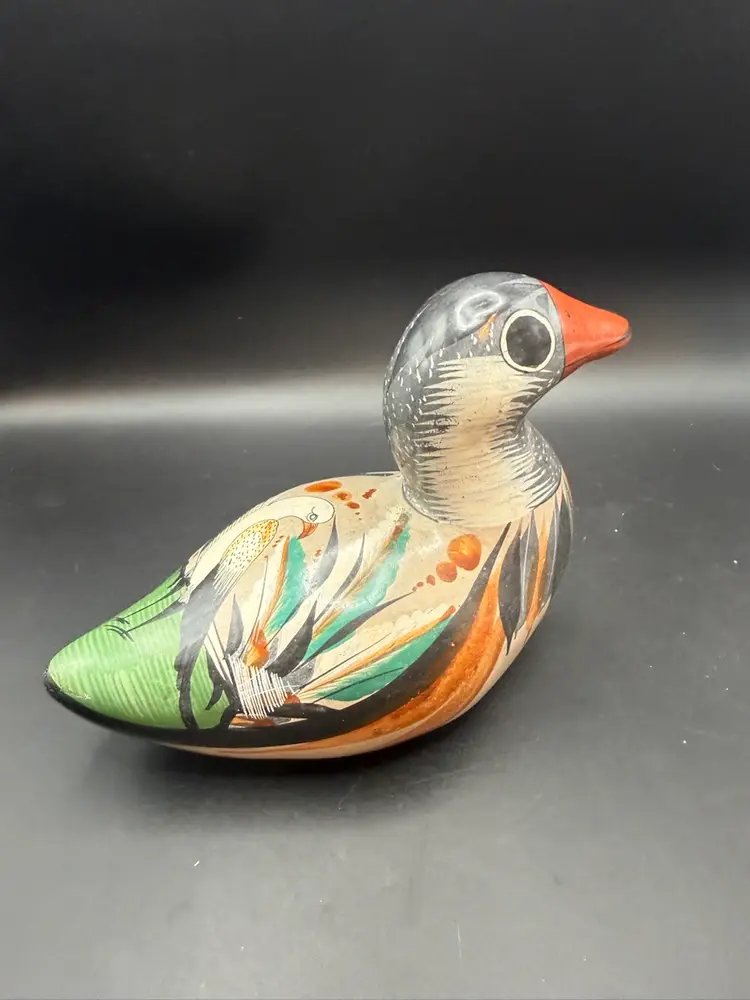 Tonala pottery is a renowned style of Mexican ceramics originating from the town of Tonala, Jalisco. This particular duck figurine exemplifies the folk art aesthetic of Tonala. The use of bright colors and stylized representations makes these pieces highly collectible and representative of Mexican cultural heritage.