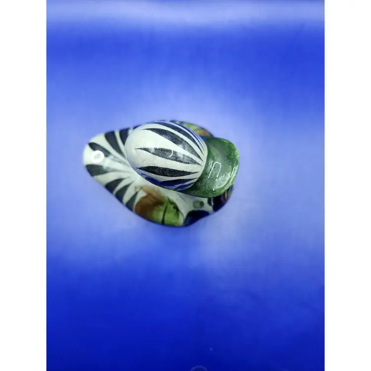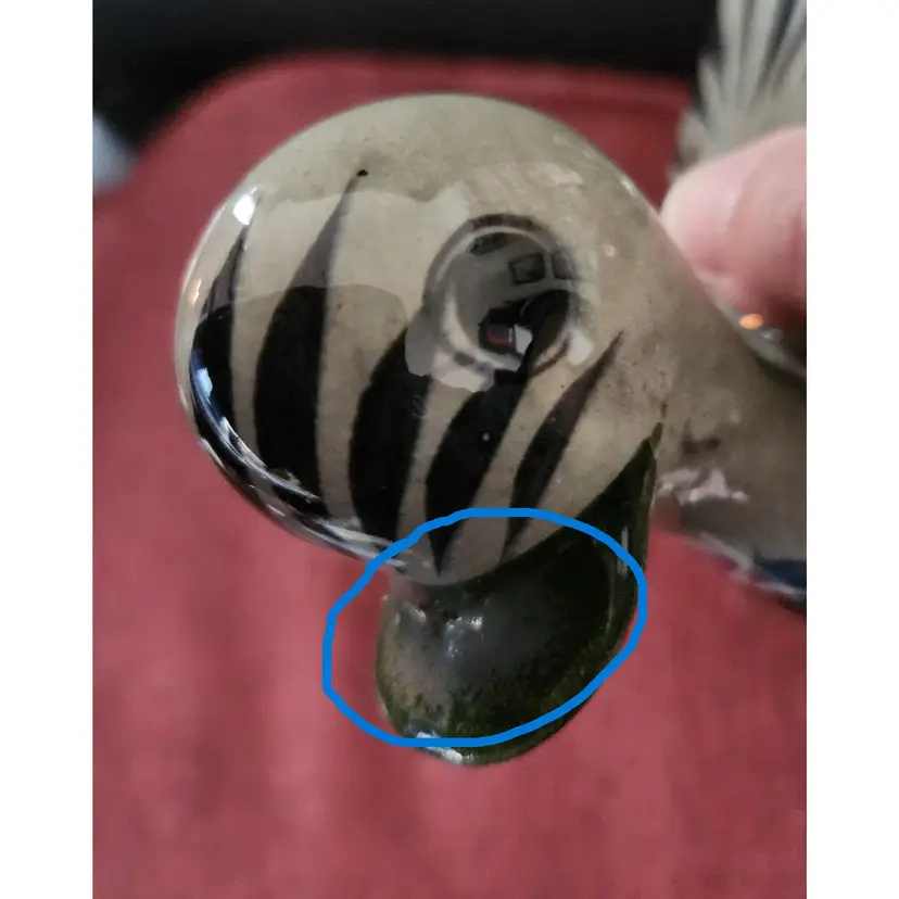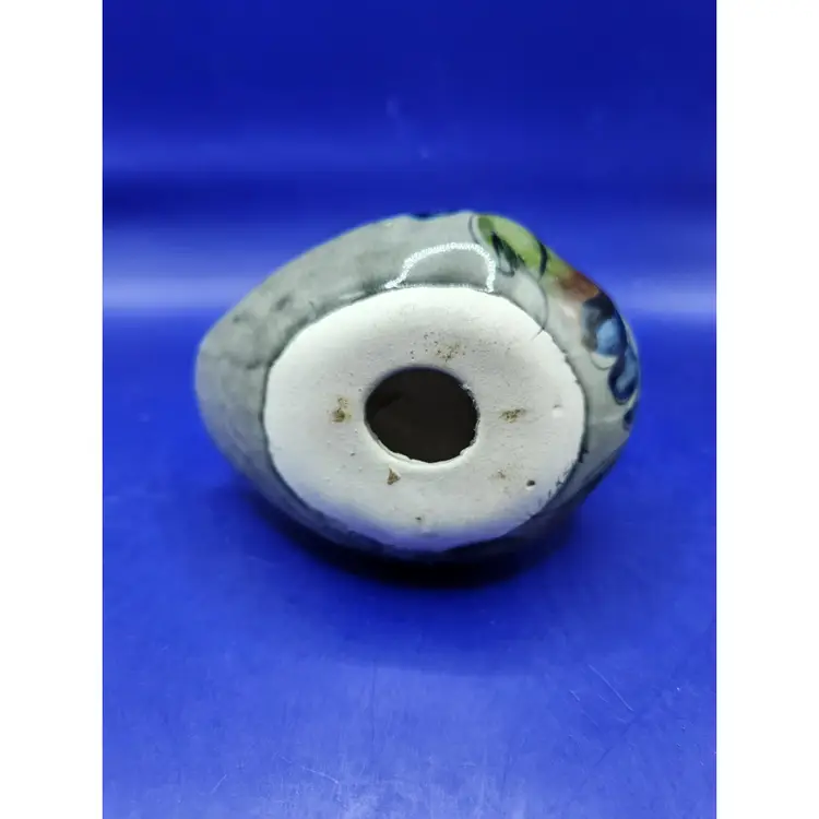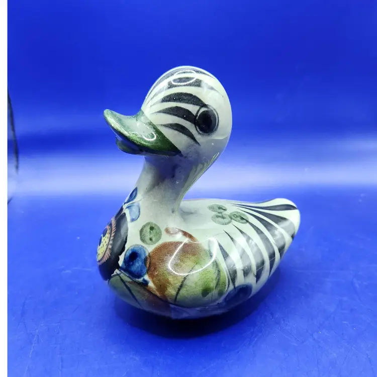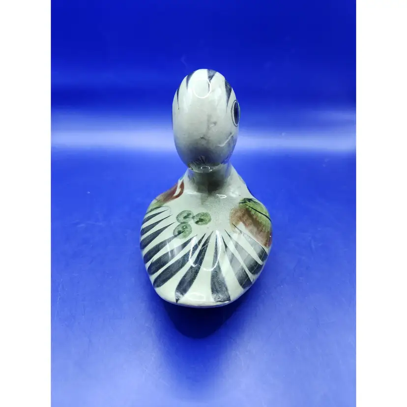 Tonala Mexican Duck Measures 5 inches tall by 4 inches in length and 3 inches wide Design of blues, greens and browns on mottled grey background One issue is that glazing was missed on top of beak (see last photo) otherwise in great condition - no chips or cracks