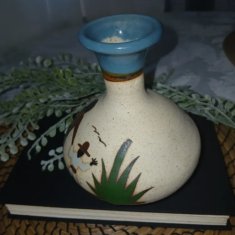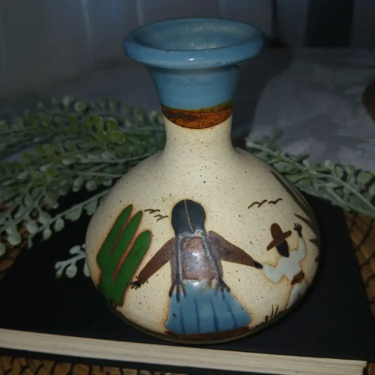 Handcrafted pottery vase originating from Tonala jalisco Mexico in colors of blue, green and brown with turquoise blue dipped bottle neck. Scene of Mother and Child in Dessert. Measures 51/2 tall 143/diameter with 2" neck