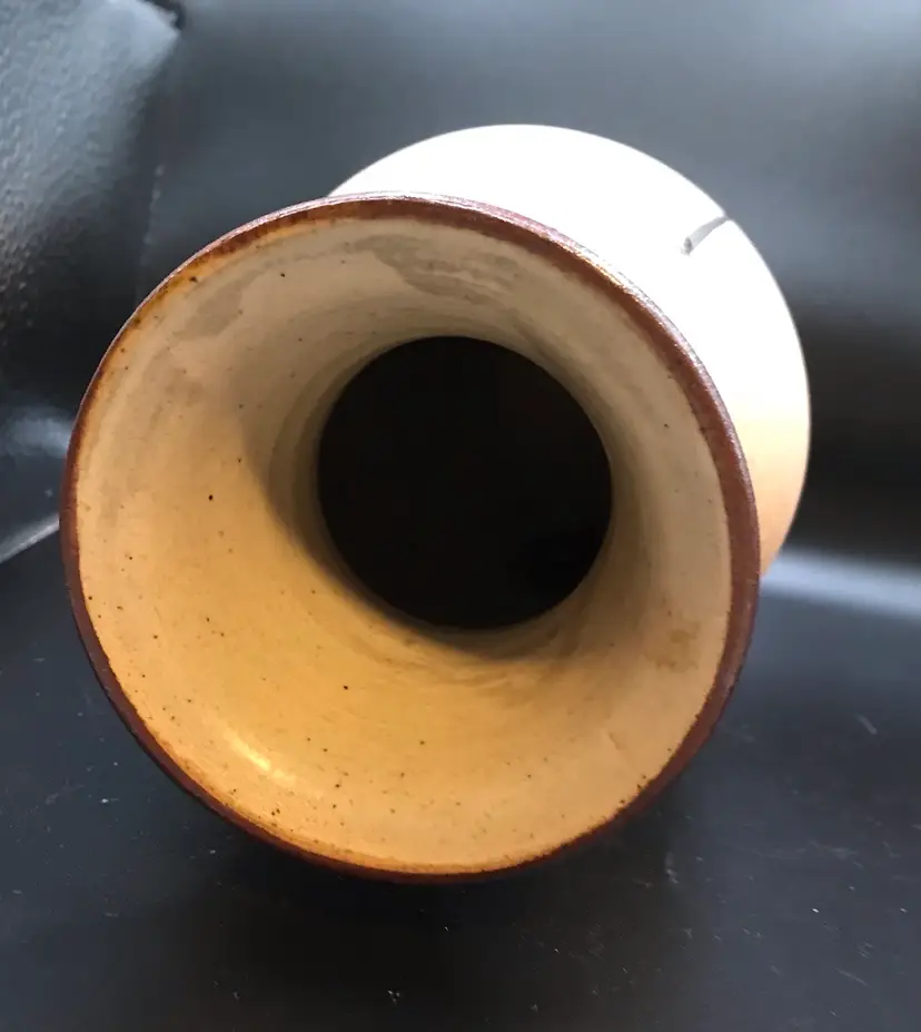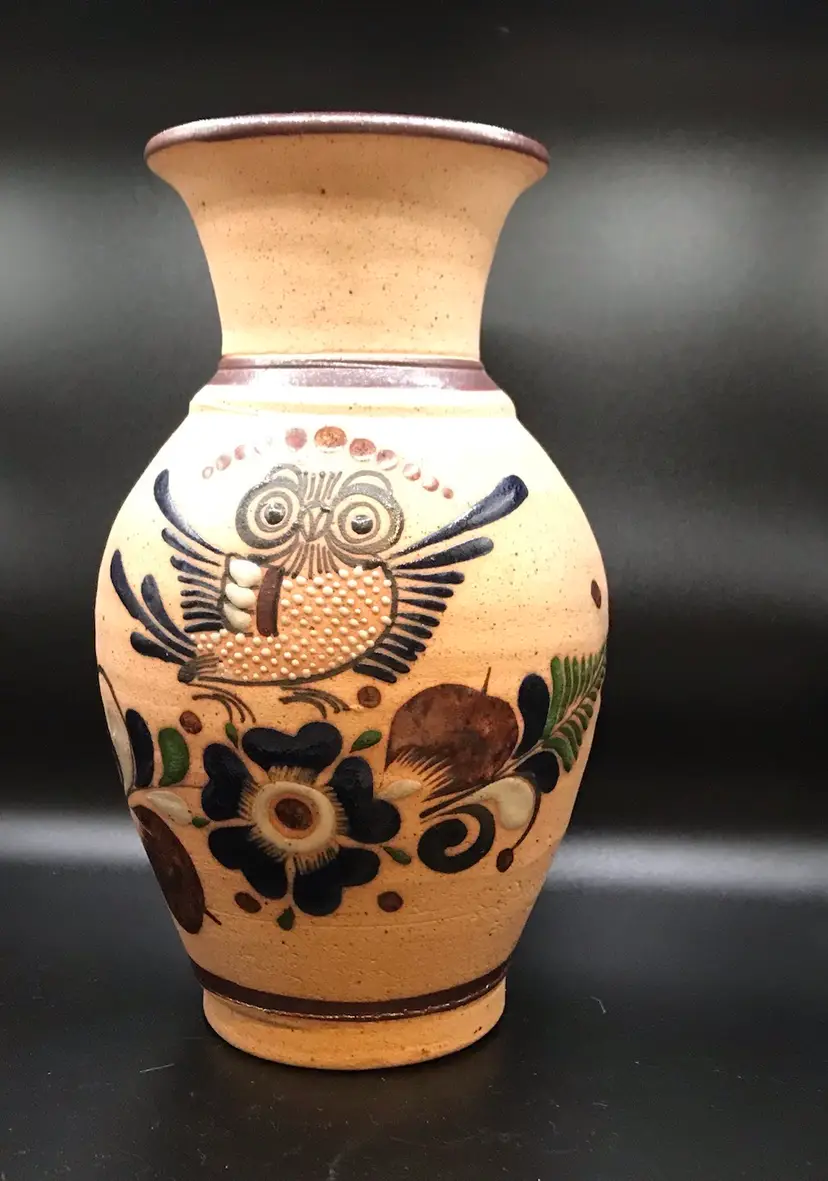 The Tonala Mexico Art Pottery Vase Owl Signed Brown Large is a beautifully handcrafted piece of Mexican art pottery. Made in Mexico, this unique vase features an owl design and is signed by the artist. The rich brown color adds a touch of warmth and elegance to any space. With its Mexican culture influences and handmade craftsmanship, this vase is sure to be a standout piece in any art collection. 8” tall. No chips or cracks. Looks like never used as vase very clean