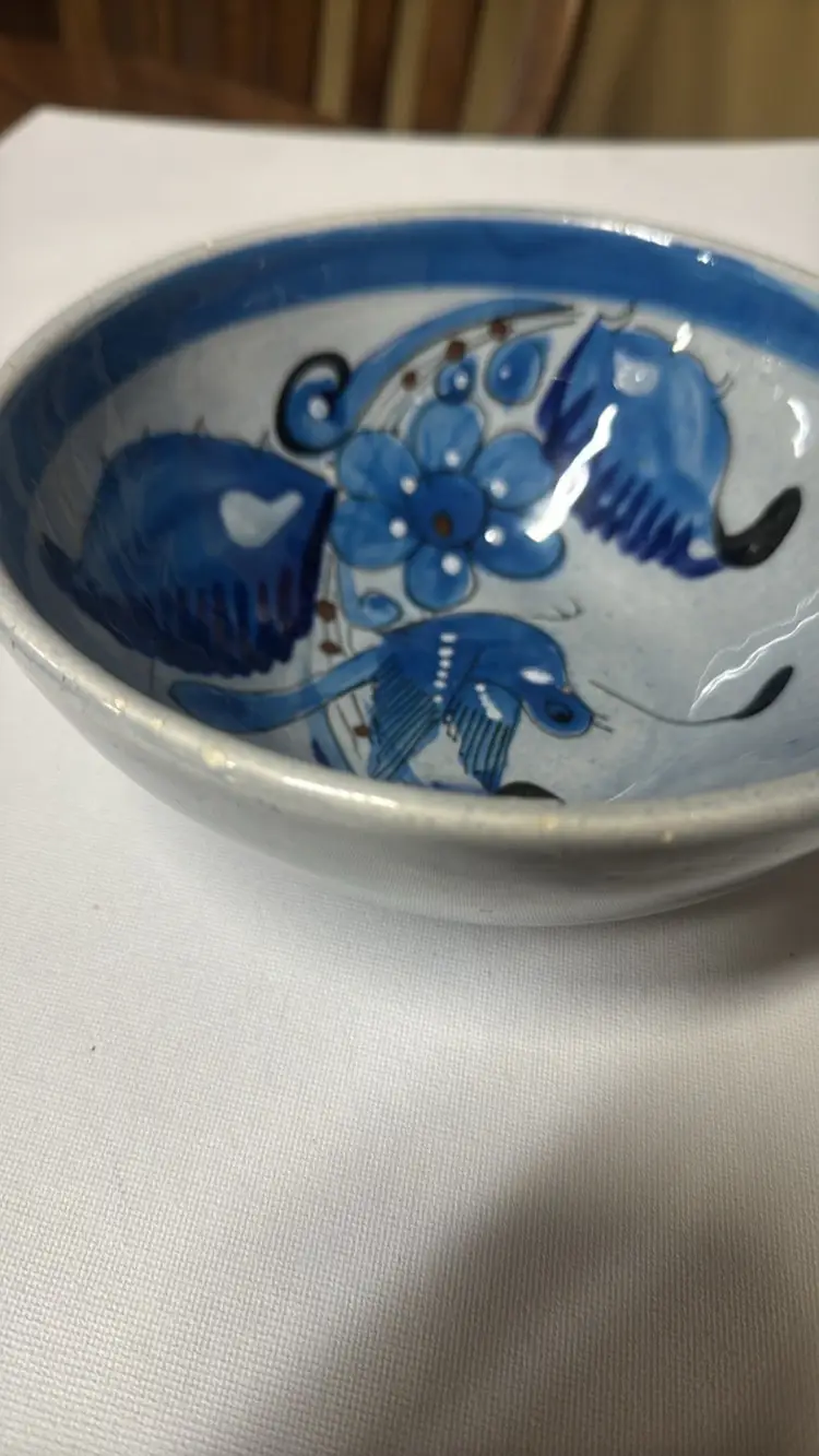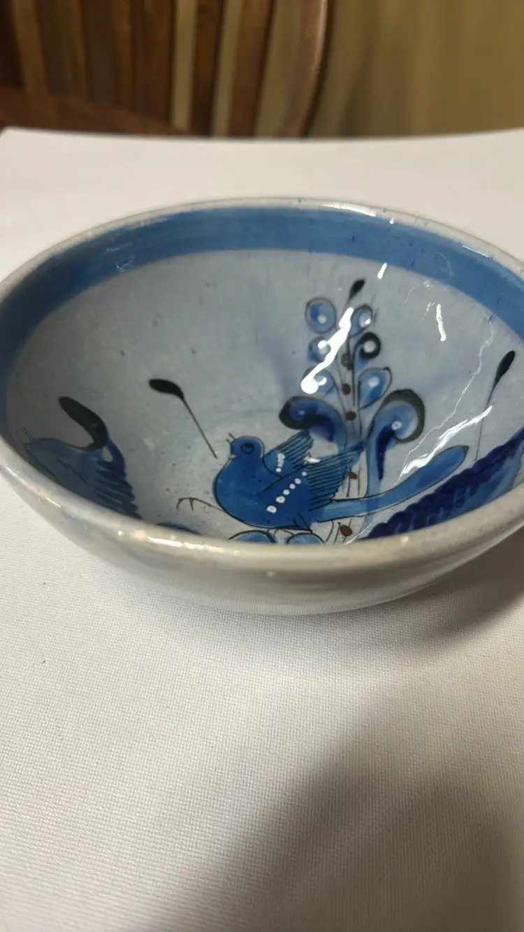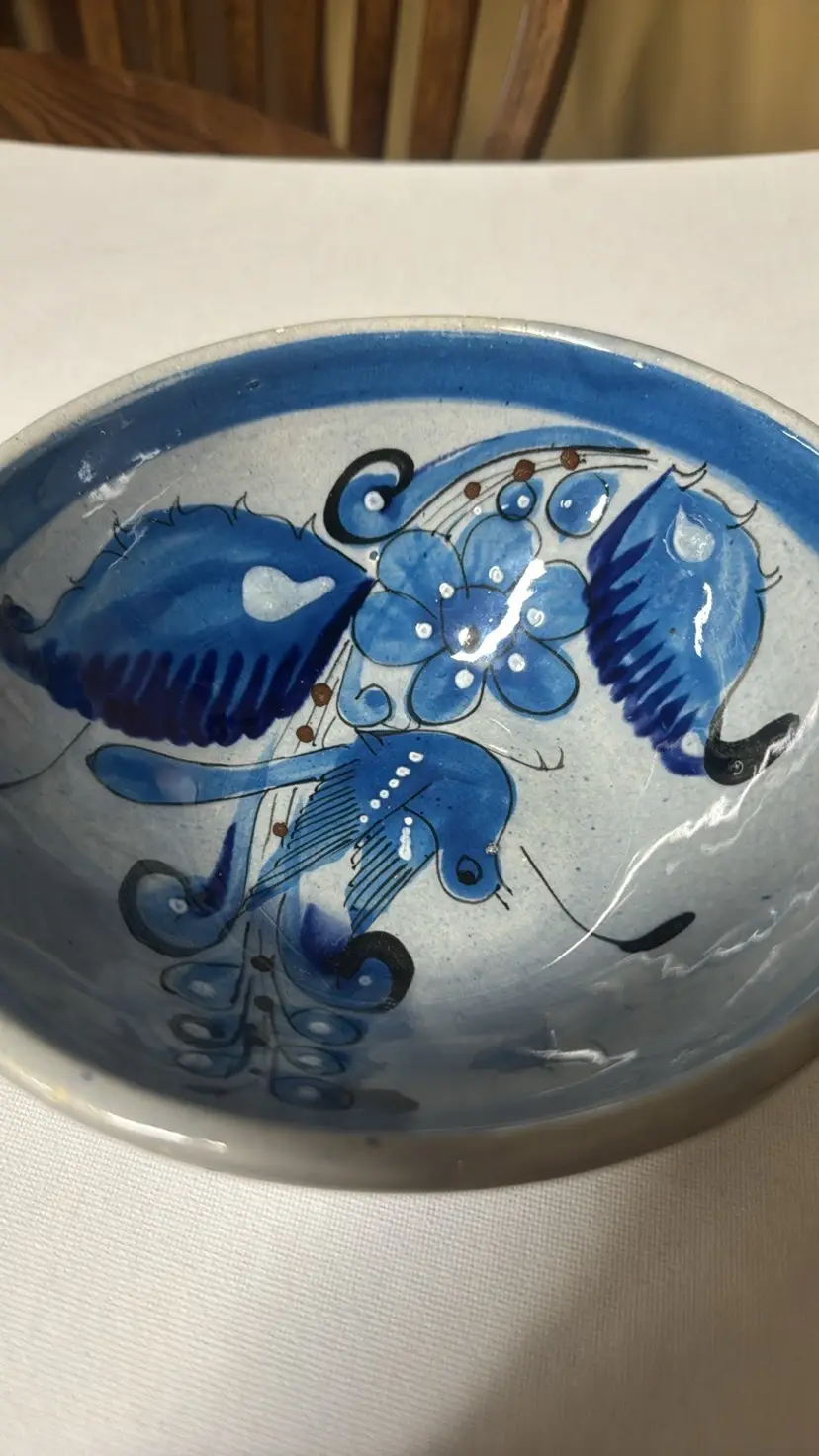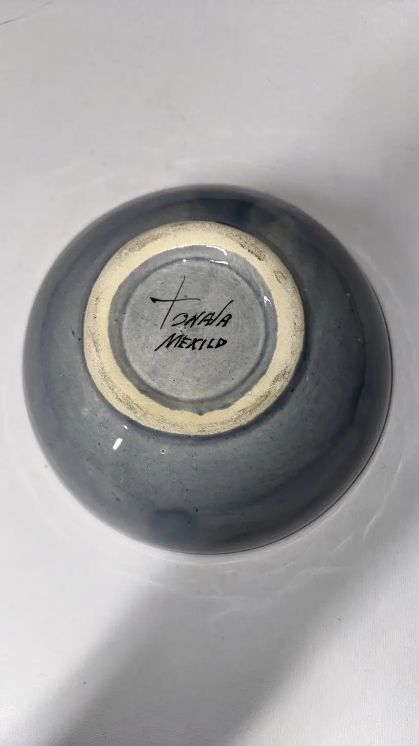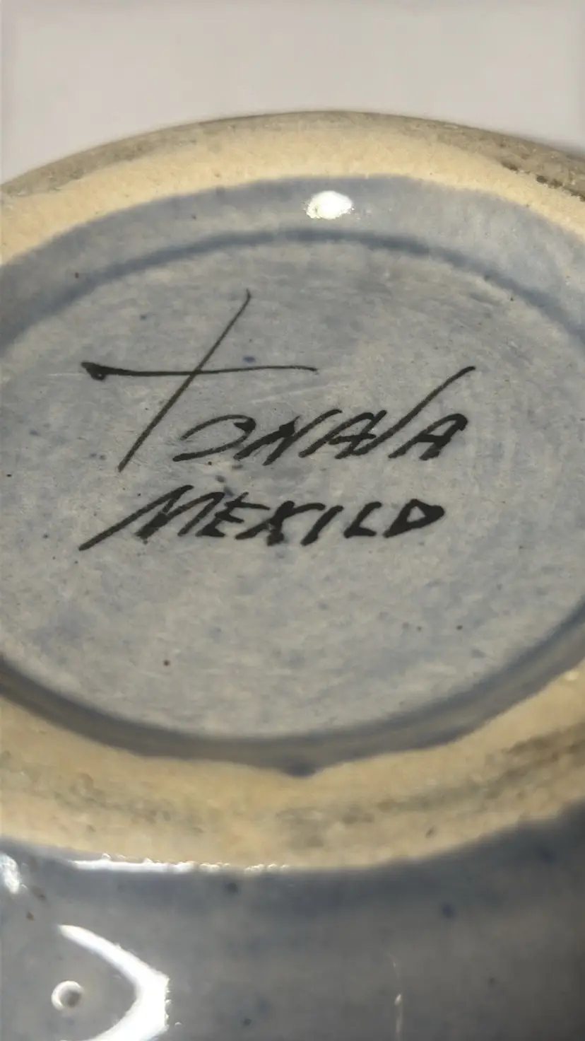 Serving Bowl Vintage Tonala Mexico Blue Bird Pottery, Signed 7” diameter 2.75” tall Beautiful in great condition there are some glaze scratches along the top edge (1762725a)