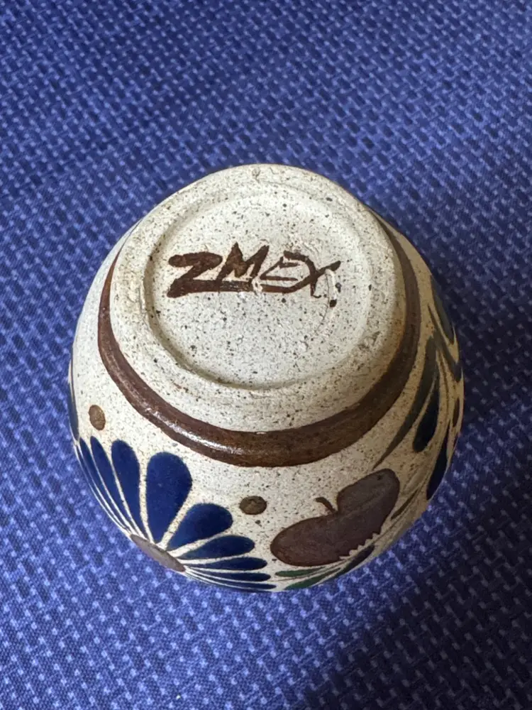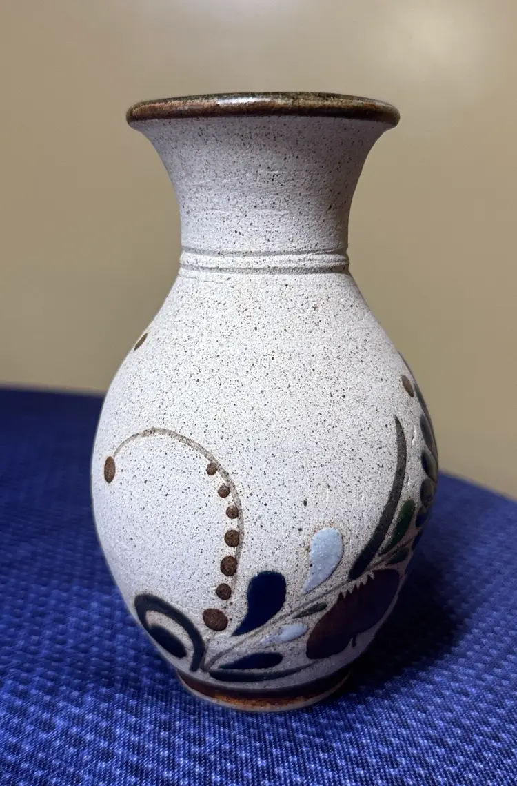 Vintage Tonala Mexico Folk Art Pottery Bud Vase Hand Painted Blue Flower 5.75" tall Enhance your home decor with this handcrafted ceramic vase featuring a beautiful floral design. The vase showcases a blend of blue, brown, and cream colors, adding a touch of elegance to any room. Excellent like new condition with no breaks or chips (1137102252)