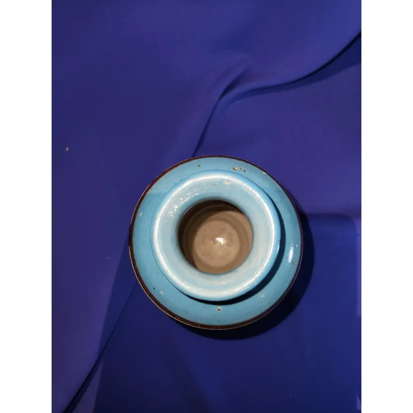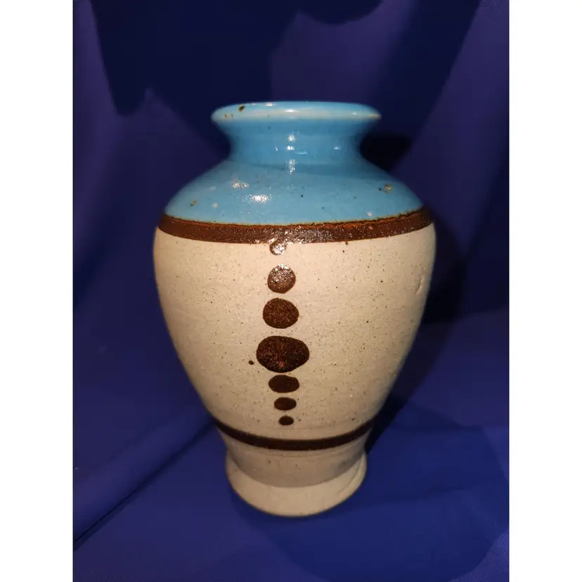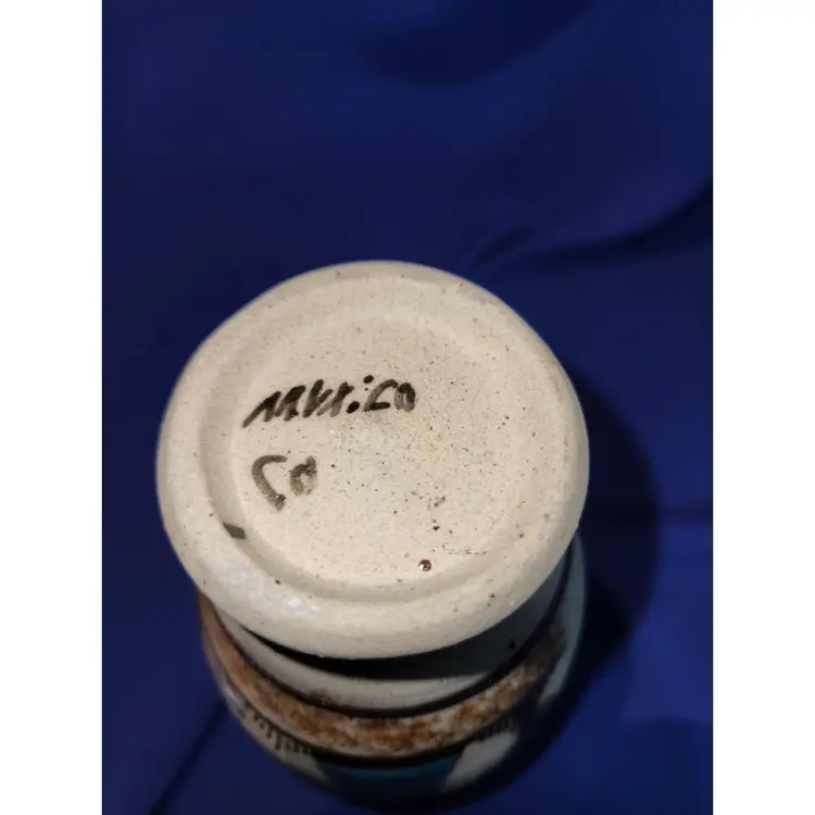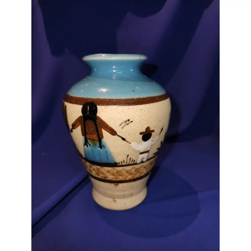 Tonala Pottery Vase Mexico Featuring Mother & Child with cactus and agave plants Mixed textures - top is glazed in light blue color - bottom is tan in rougher surface Some 'manufacturing' imperfectations Measure 6 inches tall by 3 3/4 inches at widest point