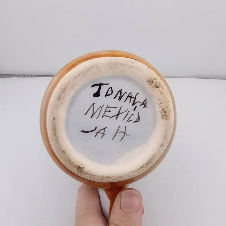 It's a great Tonala mug with bird and flower decoration. Signed by JAH, it's in excellent condition with no chips or cracks.