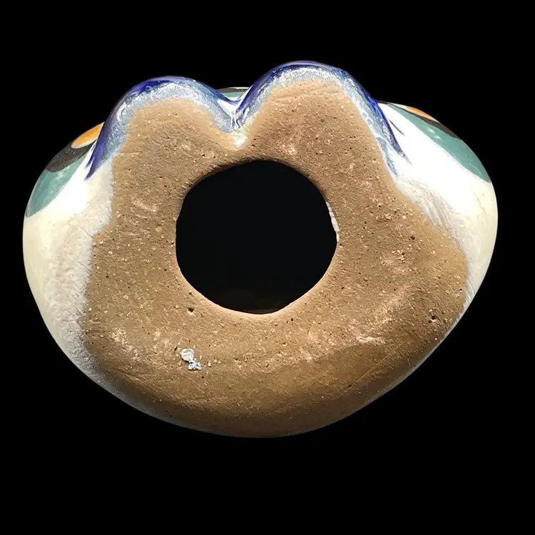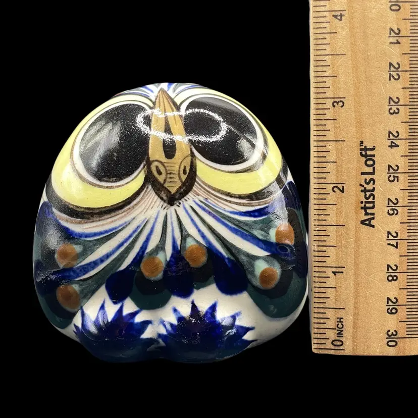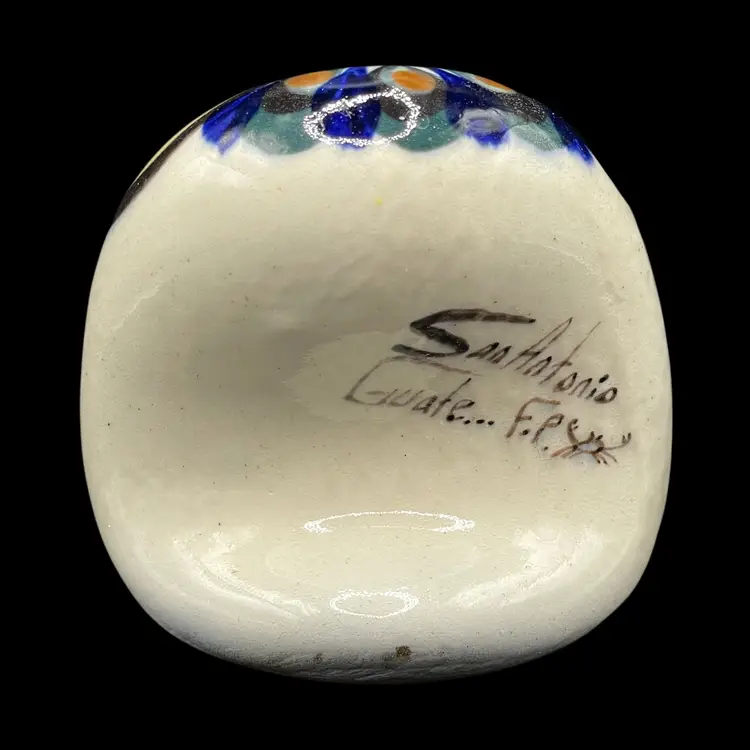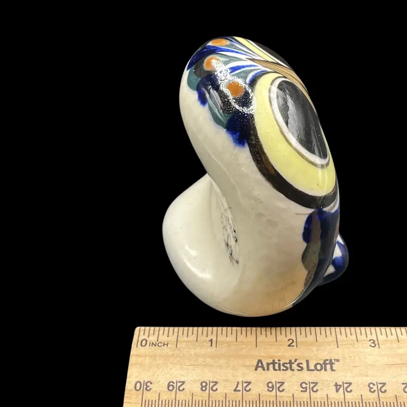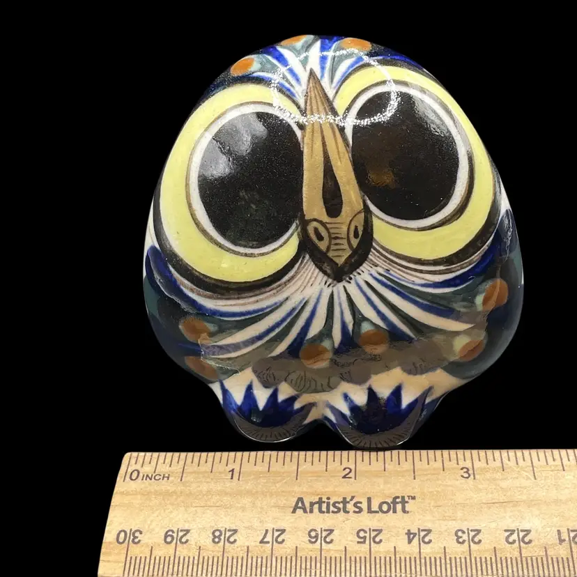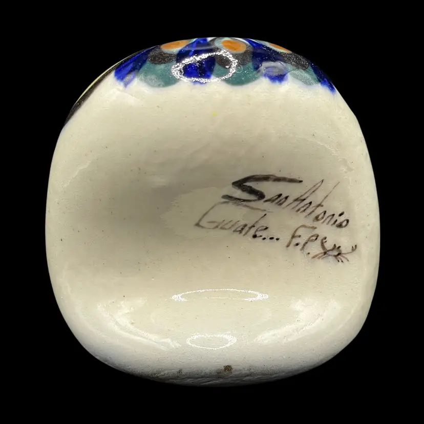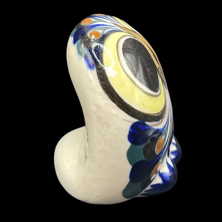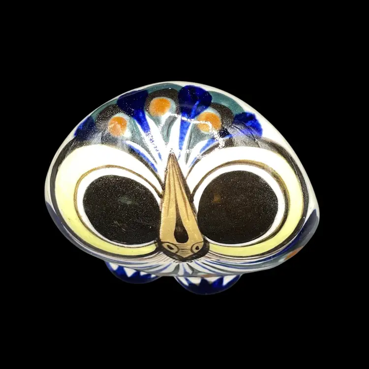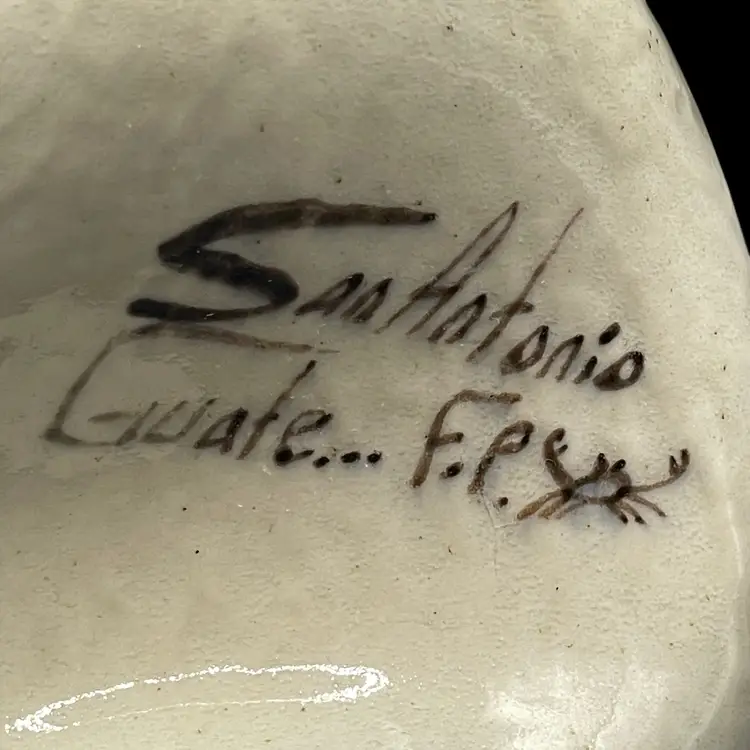 The Tonala Owl San Antonio, TX Souvenir is a handmade piece of pottery originating from Mexico. This unique item showcases traditional Mexican culture, making it a collectible item that represents the rich heritage of Latin America. Signed by the artisan, this souvenir is a charming and authentic piece that would make a lovely addition to any collection of Mexican artistry.