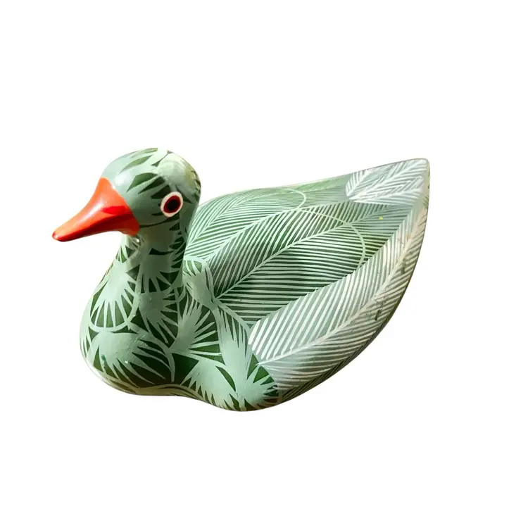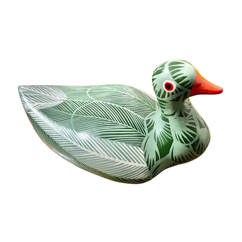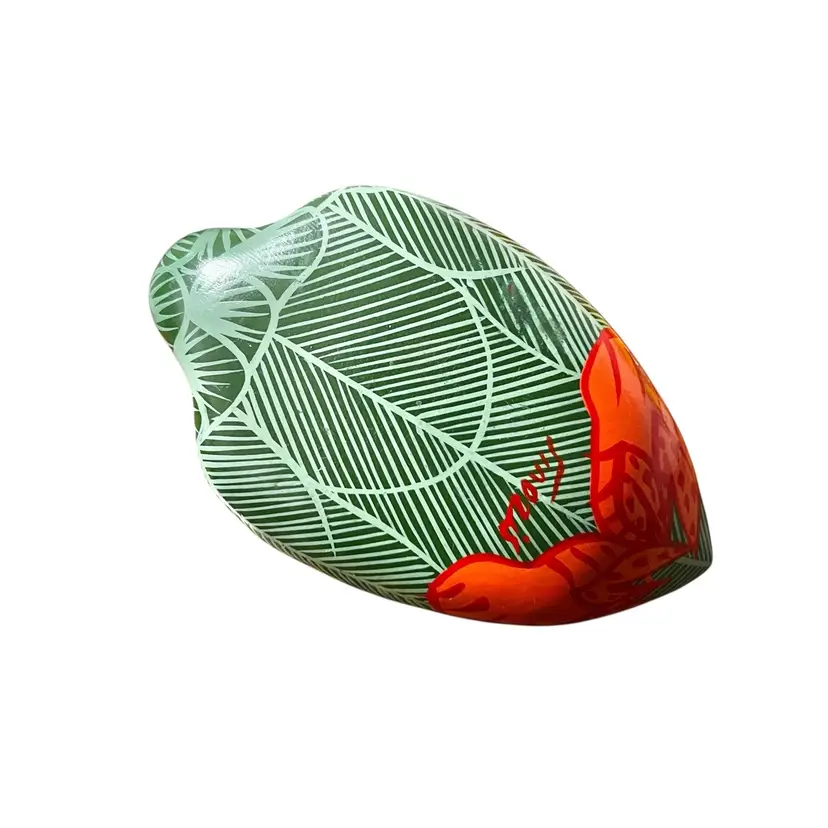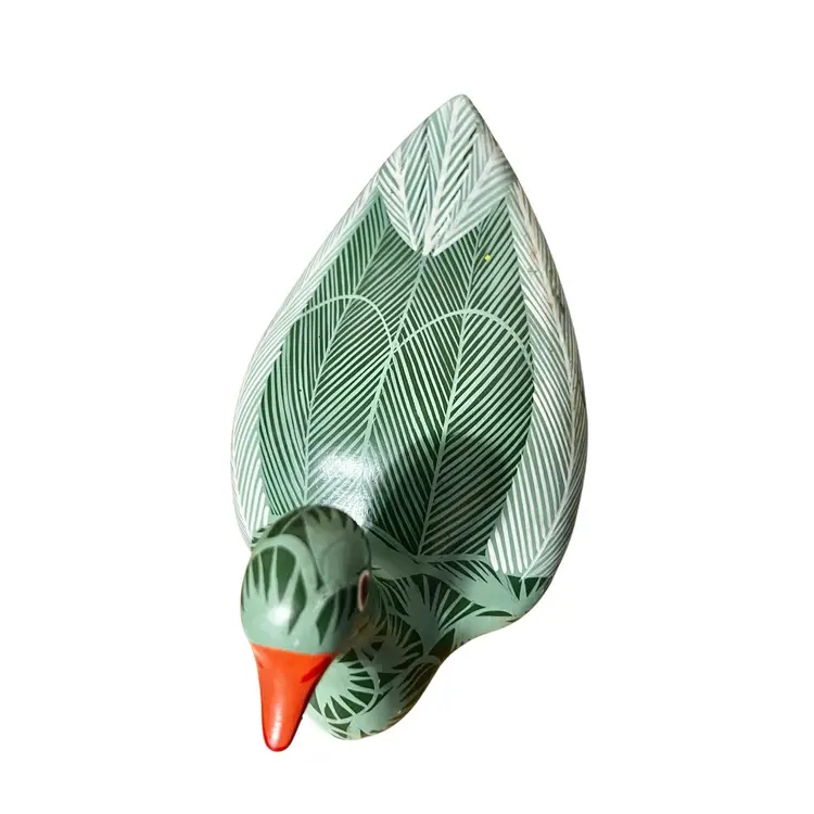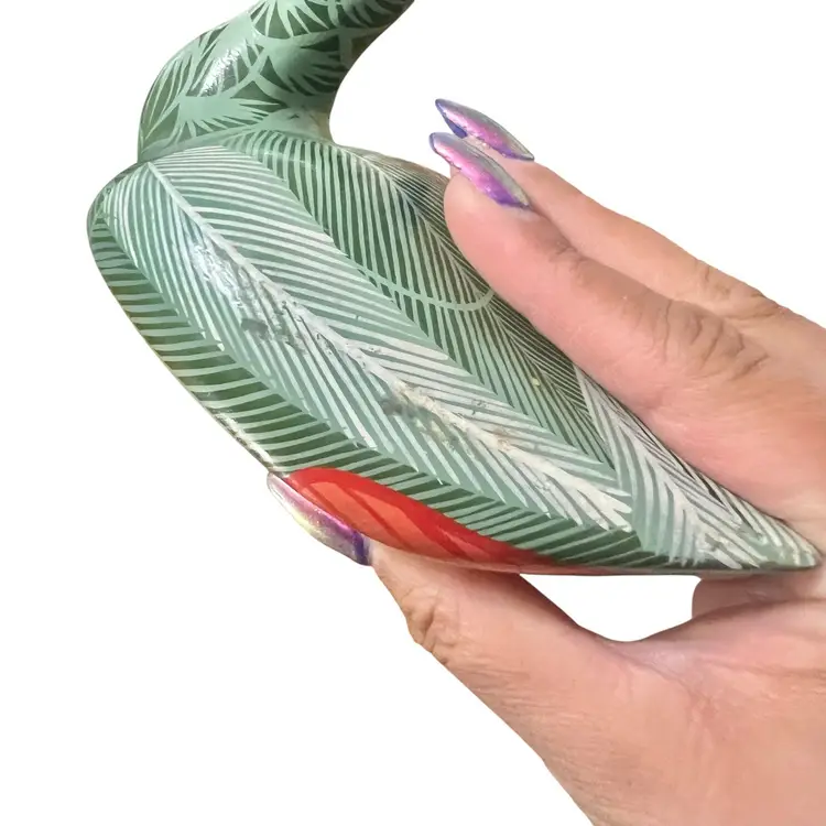 This charming Tonala pottery bird figurine is beautifully hand painted with intricate feather and leaf designs in shades of green, white, and orange. The bird has an artist signature on the base, though it is illegible. • Origin: Tonalá, Jalisco, Mexico • Design: Hand-painted folk art bird with tropical leaf and feather motifs, orange beak and tail, and a bold red accent eye • Size: 3.5” tall (head down) × 6” long × 3.25” wide • Condition: Excellent vintage condition – no chips or cracks. Some light discoloration present on one side (see photos).