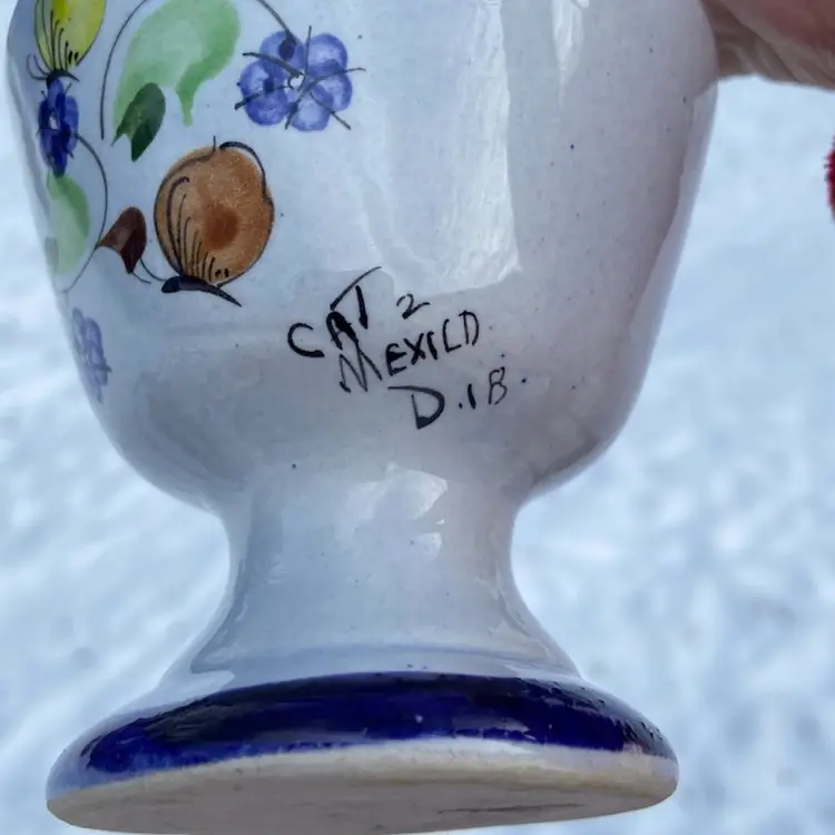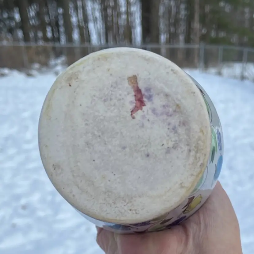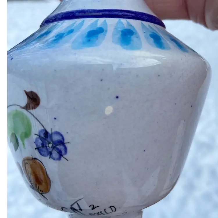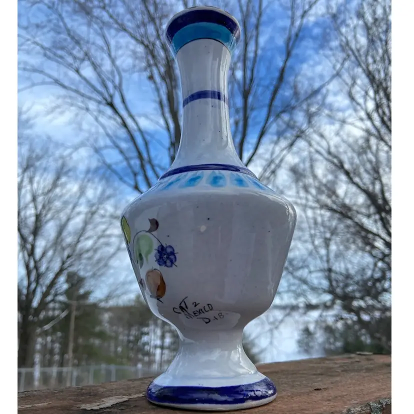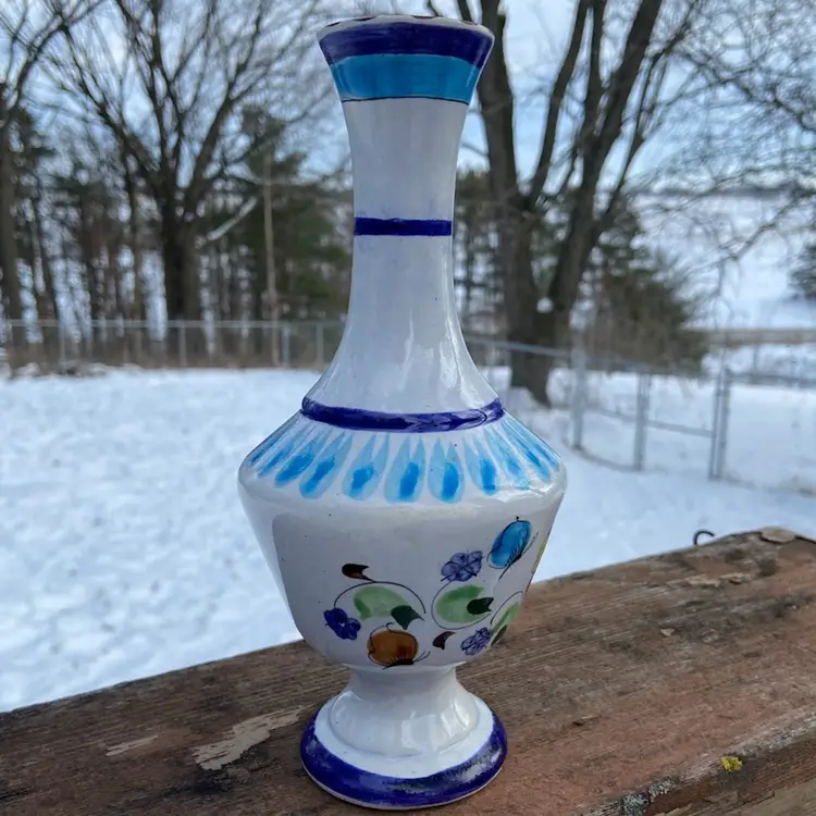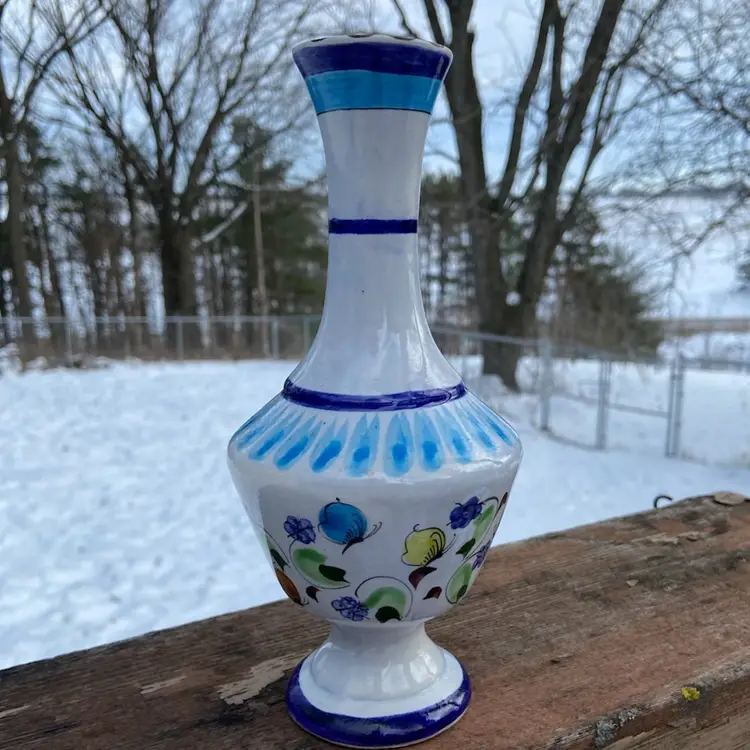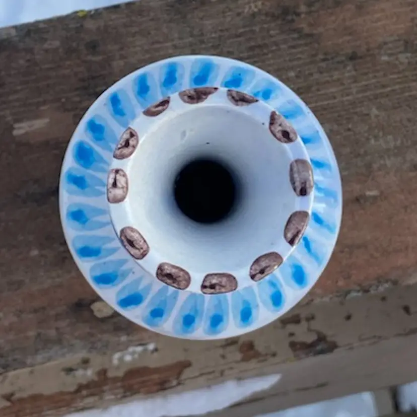 Approx: 8.25” h x 3”w, opening 5/8”. Preowned condition. No chips or cracks. One area of missed glaze. See images as part of description.