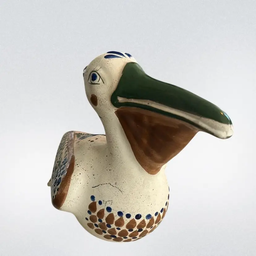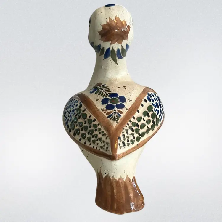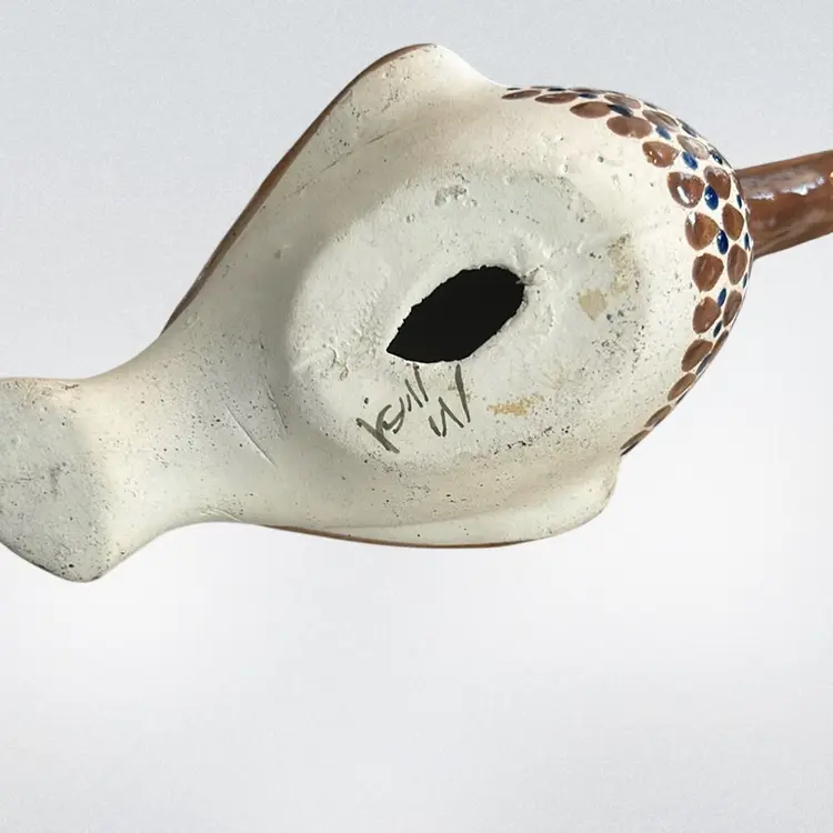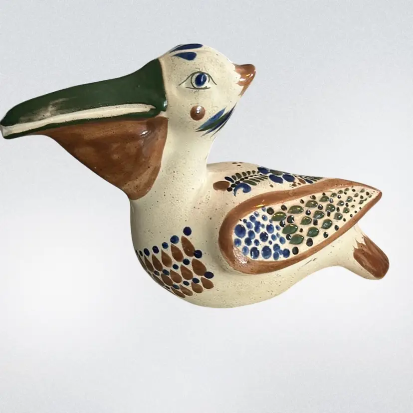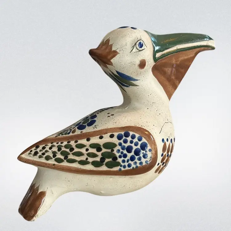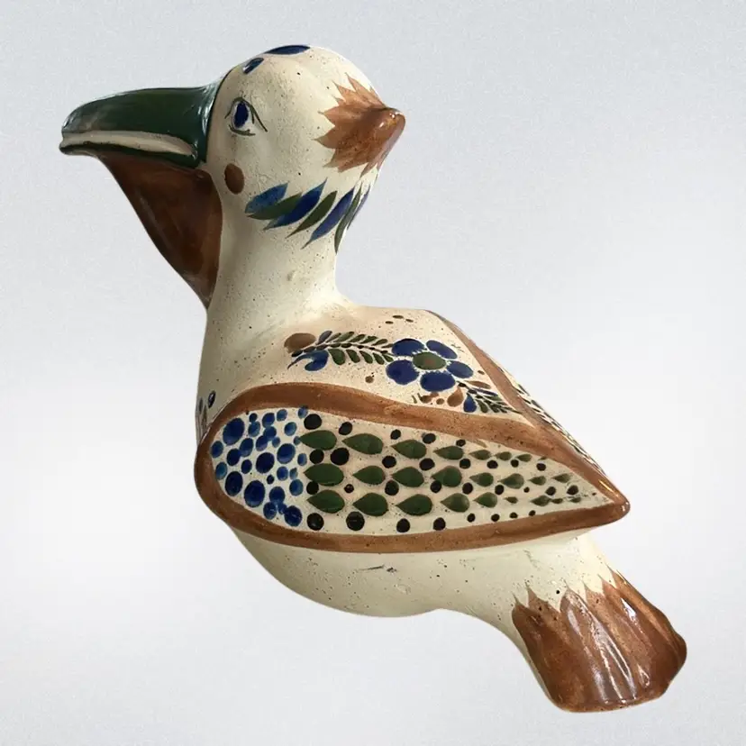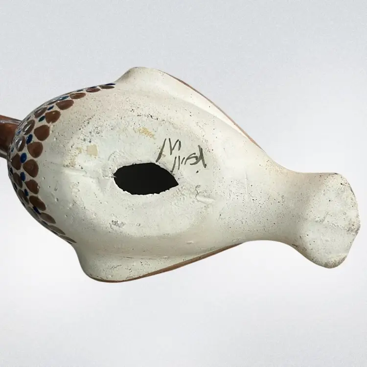 Crafted in Tonala, Mexico, and often features a hand-painted signature on the bottom. Typically hand-painted with polychrome floral motifs and whimsical details. Made of ceramic/clay. Commonly produced during the mid-century modern era (circa 1960s-1970s) it measures approximately 6 1/2 inches tall and 9 inches long. Signed by the artist and is in mint condition (BSA6)